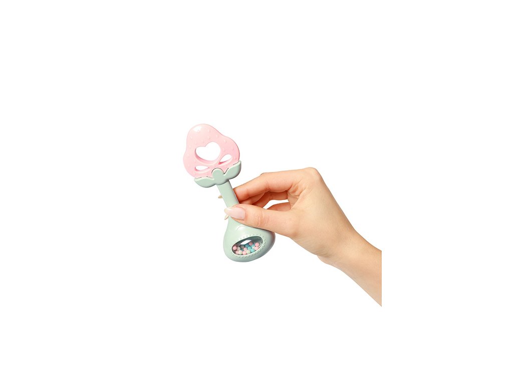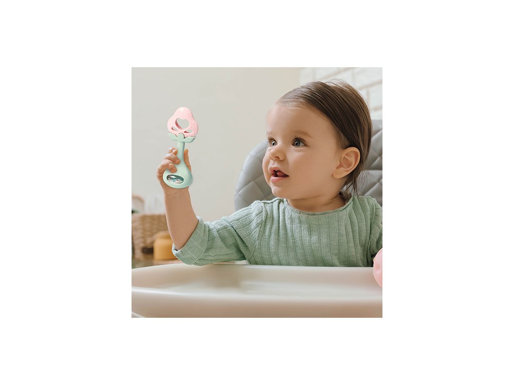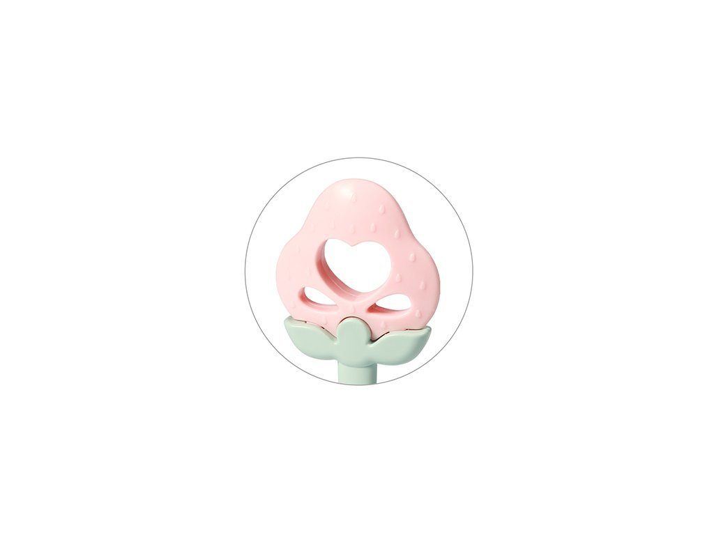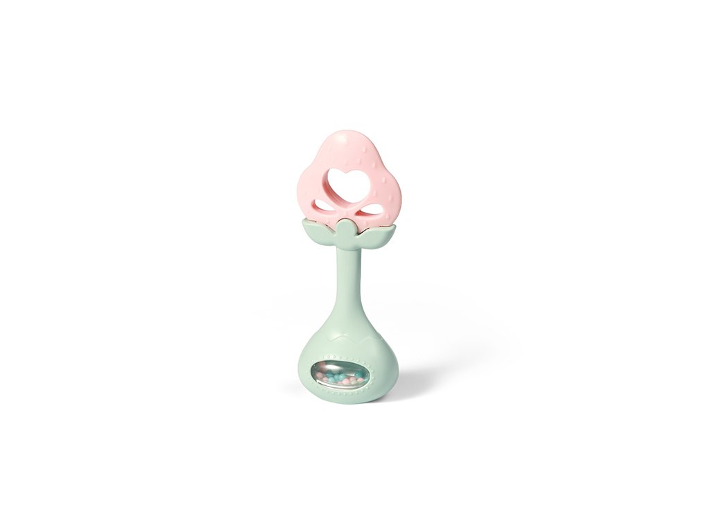 Zatiaľ čo hryzenie poskytuje úľavu v období prerezávania zúbkov , jeho hladký povrch jemne trie ďasná dieťaťa. Vnútro výrobku je domovom hrkajúcich korálikov, ktoré pri pohybe vydávajú zvuk , čím povzbudzujú dieťa k zábave a stimulujú jeho pozornosť. Vďaka svojmu tvaru ho dieťatko ľahko drží vo svojich malých rúčkach.