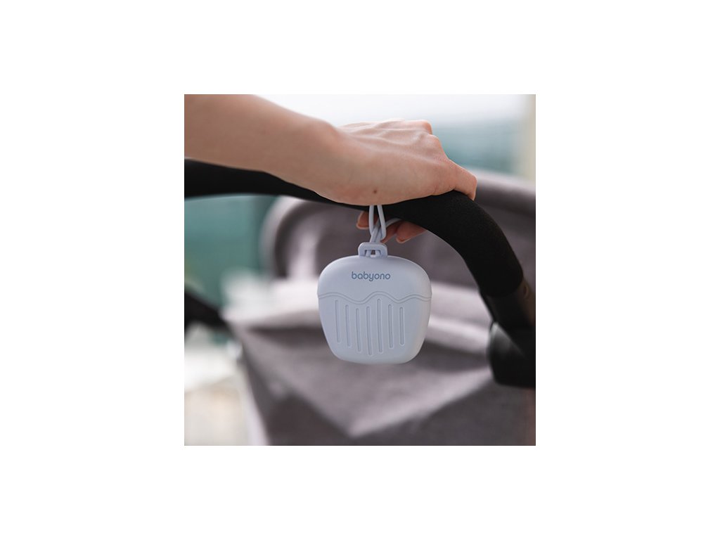 Puzdro má dostatok miesta na dva cumlíky bežnej veľkosti. Vďaka dlhému a flexibilnému popruhu ho môžete pripevniť na tašku, batoh, kočík alebo postieľku. Na rýchle vloženie a vybratie cumlíka stačí jedna ruka cez špeciálny otvor .