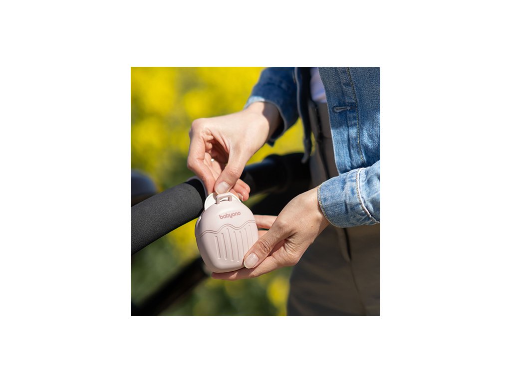 Puzdro má dostatok miesta na dva cumlíky bežnej veľkosti. Vďaka dlhému a flexibilnému popruhu ho môžete pripevniť na tašku, batoh, kočík alebo postieľku. Na rýchle vloženie a vybratie cumlíka stačí jedna ruka cez špeciálny otvor .