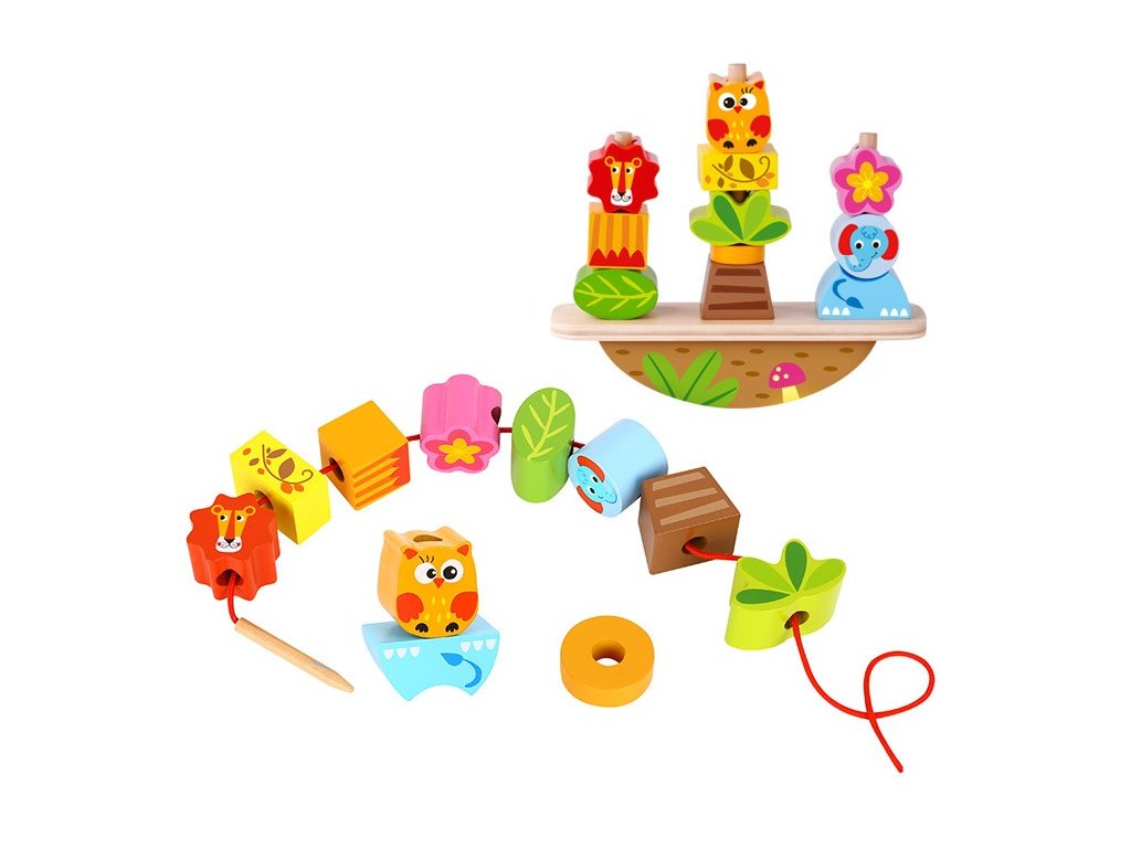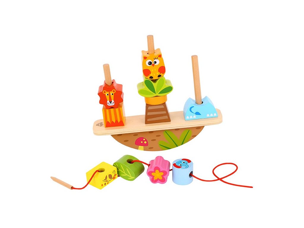 Balančné nasadzovanie Zvieratká Podarí sa ti vyrovnať hojdačku? Detičky musia nasadiť kocky s dierkami na hojdaciu základňu tak, aby bola v rovnováhe. Hra obsahuje 3 nasadzovacie zvieracie hlavičky a ďalšie pestrofarebné a rôzne tvarované dieliky. Deti tak môžu na hojdačke tvoriť rôznorodé kreácie. Hra je ale multifunkčná a kocky je možné navliekať aj na priložený povrázok s bezpečnou drevenou ihlou.Deti si cvičia koordináciu oko-ruka. Zlepšujú si jemnú motoriku a učia sa chápať rovnováhu. Ide o klasickú drevenú hračku pre samostatnú hru, ktorá je vyrobená z kvalitného, dobre opracovaného dreva a nezávadných farieb.Dodatočné parametre