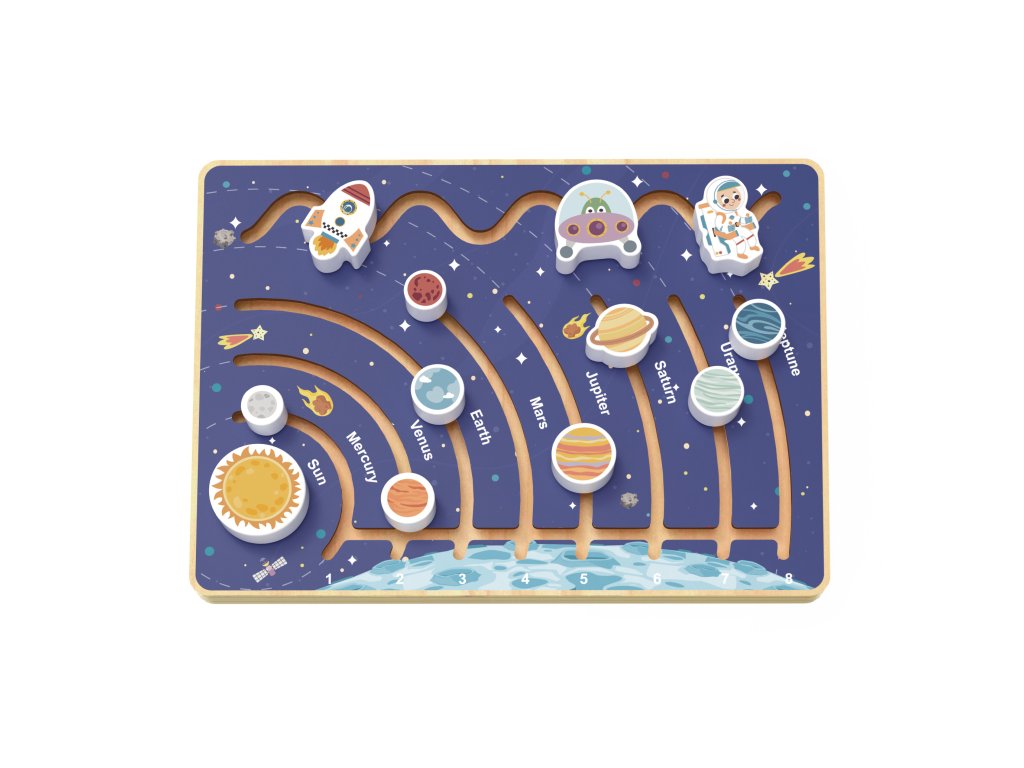 Bludisko Slnečná sústava Motorické bludisko vhodné od 18 mesiacov Drevený motorický labyrint so Slnečnou sústavou a ďalšími vesmírnymi objektmi od Tooky Toy zaujme deti už od 18 mesiacov, ale učiť sa s ním budú aj predškoláci. Originálna bludisko obsahuje celú Slnečnú sústavu so všetkými planétami, ktorými je možné pohybovať v rámci vyznačených koľají. Nechýba ani vkladacie slnko a ďalšie objekty, ako je ufo, raketa či astronaut.Deti sa učia hrou Originálne drevené bludisko Slnečná sústava rozvíja jemnú motoriku, koordináciu pohybov, schopnosť sústredenia, pozorovacie aj logické schopnosti. Drevené hračky pre deti od Tooky Toy sú vyrobené z pevného dreva z udržateľného lesníctva, natreté netoxickými farbami a pre deti sú bezpečné.Dodatočné parametre