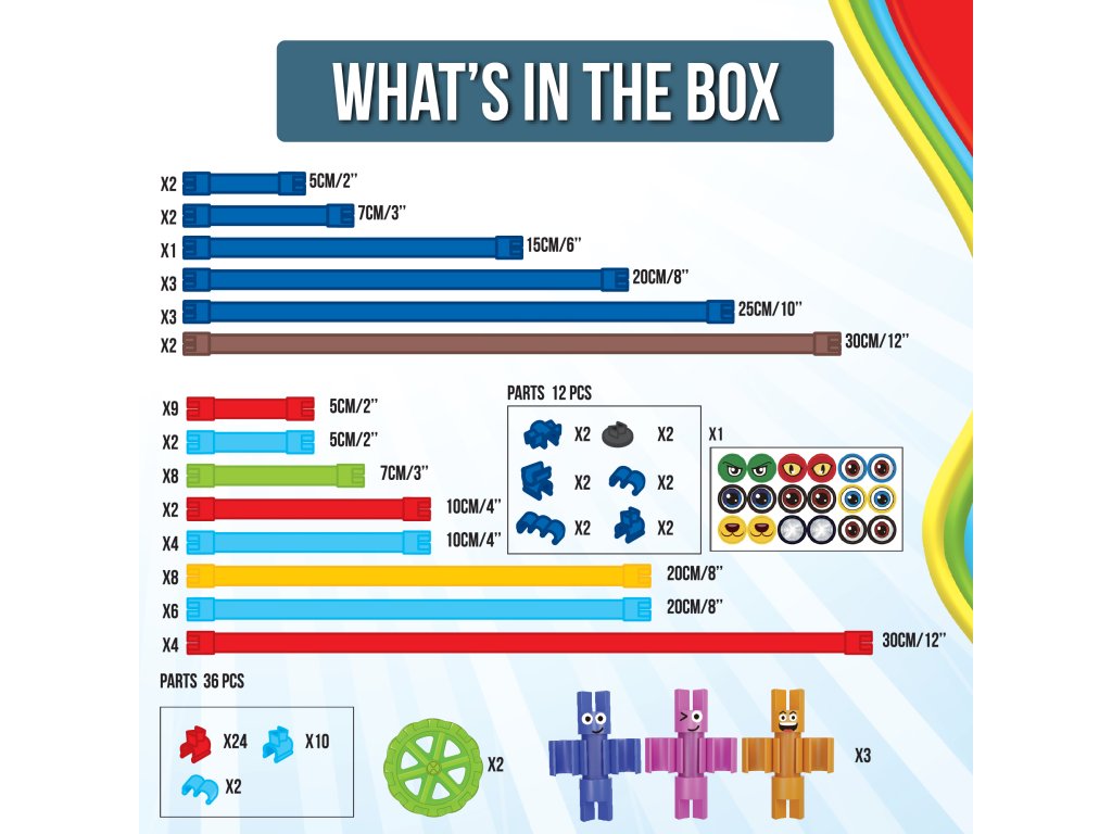 Kreativní Spaghetteez 100 ksSestavujte, ohýbejte a vytvářejte figurky podle své fantazieKreativní a flexibilní Spaghetteez 100 ks od belgické značky Clics Toys přináší neomezené kreativní možnosti a umožňuje dětem vytvářet různé 2D a 3D figurky. Balení obsahuje různě dlouhé barevné a ohebné dílky, které připomínají špagety, spolu s dalšími konstrukčními prvky a návodem na vytvoření úžasných modelů. Díky speciálnímu zacvakávacímu systému na koncích se dílky snadno spojují - stačí je spojit, otočit a můžete začít ohýbat a modelovat.stavebnice Spaghetteez přináší zábavu, rozvíjí a uklidňujeTato kreativní stavebnice je nejen hračkou, ale také smyslovou a antistresovou pomůckou, která podporuje jemnou motoriku a rozvíjí kreativitu. Děti si mohou podle návodu nebo vlastní fantazie postavit různé modely, například ruské kolo, příšery nebo jiné úžasné výtvory, se kterými si pak mohou hrát. Práce s ohebnými dílky pomáhá dětem zklidnit se a snížit stres. Spaghetteez se často používá jako vzdělávací pomůcka, fidget hračka nebo kreativní stavebnice. Tato stavebnice je vhodná pro děti od 4 let a je ideálním dárkem pro malé tvůrce.Doplňkové parametry