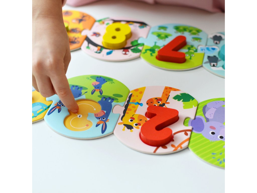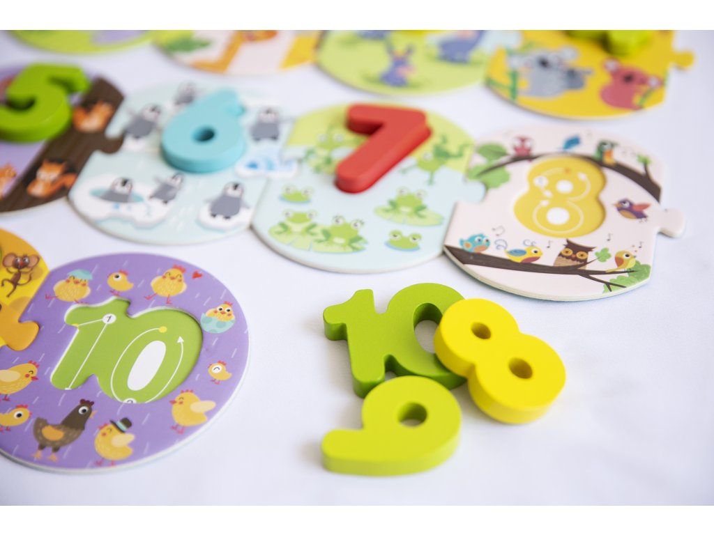 Sčítání čísel Puzzle Krásné puzzle se zvířátky a číslyPoložte číselnou řadu, spočítejte zvířátka a vložte dřevěná čísla do správných otvorů. Děti se hravou formou naučí počítat do deseti a zvyknou si hrát samostatně. Skládáním a počítáním si rozvíjejí jemnou motoriku, logické a matematické myšlení.velké dílky vhodné pro malé ruceJednotlivé dílky puzzle a dřevěná čísla jsou odolné a dostatečně velké, aby je snadno uchopila i malá dětská ruka. Díky tomu je hra vhodná pro děti již od 24 měsíců. Obsahuje 10 dílků puzzle se zvířátky a 10 dřevěných čísel, se kterými si děti mohou hrát i samostatně.Doplňkové parametry