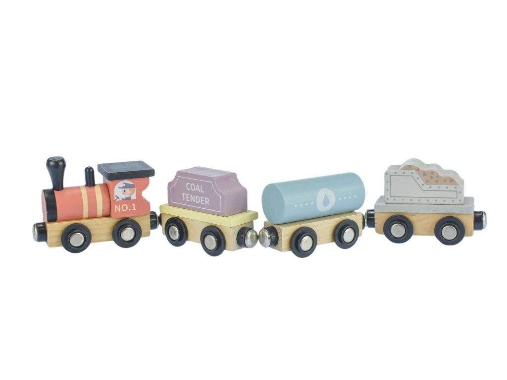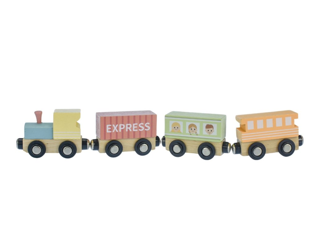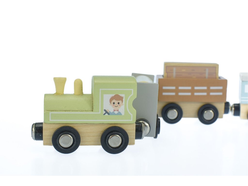 Holzeisenbahn-Set 12 Stück PastellEin Set mit 12 Holzeisenbahnen in einer Holzvitrine in Pastellfarben wird alle Eisenbahnfans, aber auch Autoliebhaber ansprechen. Das Set enthält 3 Holzzüge und 9 verschiedene Personen- und Transportwagen. Alle lassen sich wunderbar mit Magneten verbinden. Die Holzvitrine kann während des Spiels als Bahnhof oder Parkplatz dienen. Nach dem Spielen räumen die Kinder alles wieder auf.Holzeisenbahnzüge für die HolzeisenbahnstreckeKinder können aber auch selbstständig mit ihnen spielen. Sie verbessern ihre Feinmotorik, die Hand-Augen-Koordination und entwickeln ihre Fantasie. Beim Spielen in der Gruppe trainieren sie ihre sozialen und kommunikativen Fähigkeiten. Die Züge werden aus Holz aus nachhaltiger Forstwirtschaft und mit Rücksicht auf die Sicherheit der Kinder hergestellt.Zusätzliche Parameter