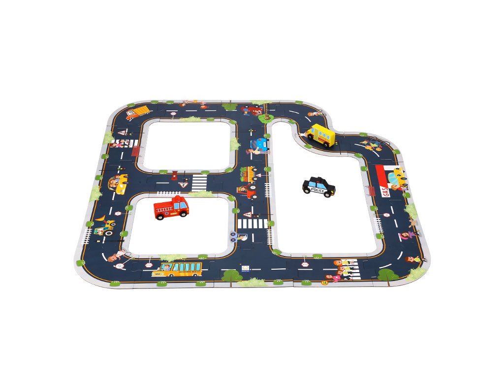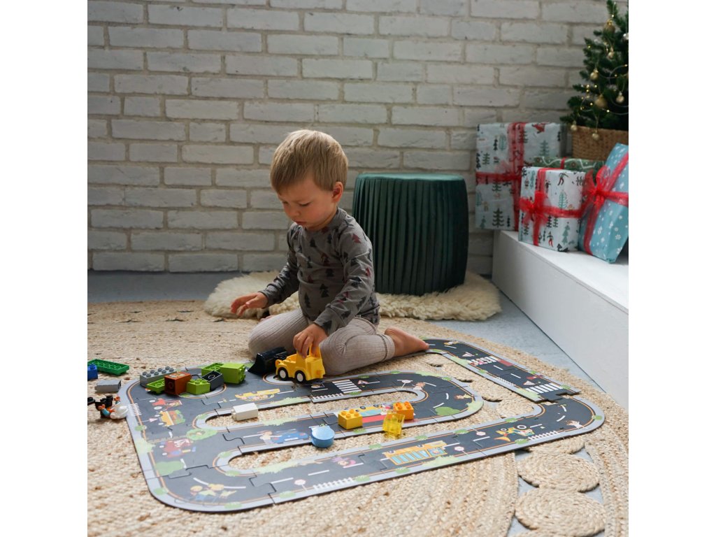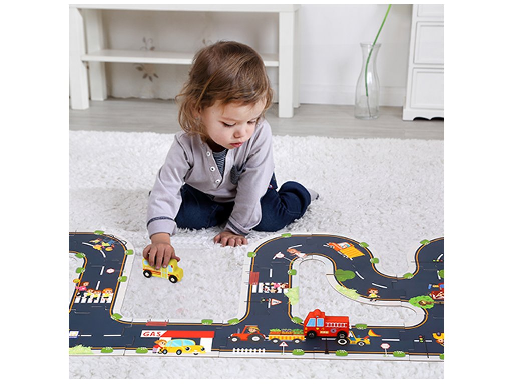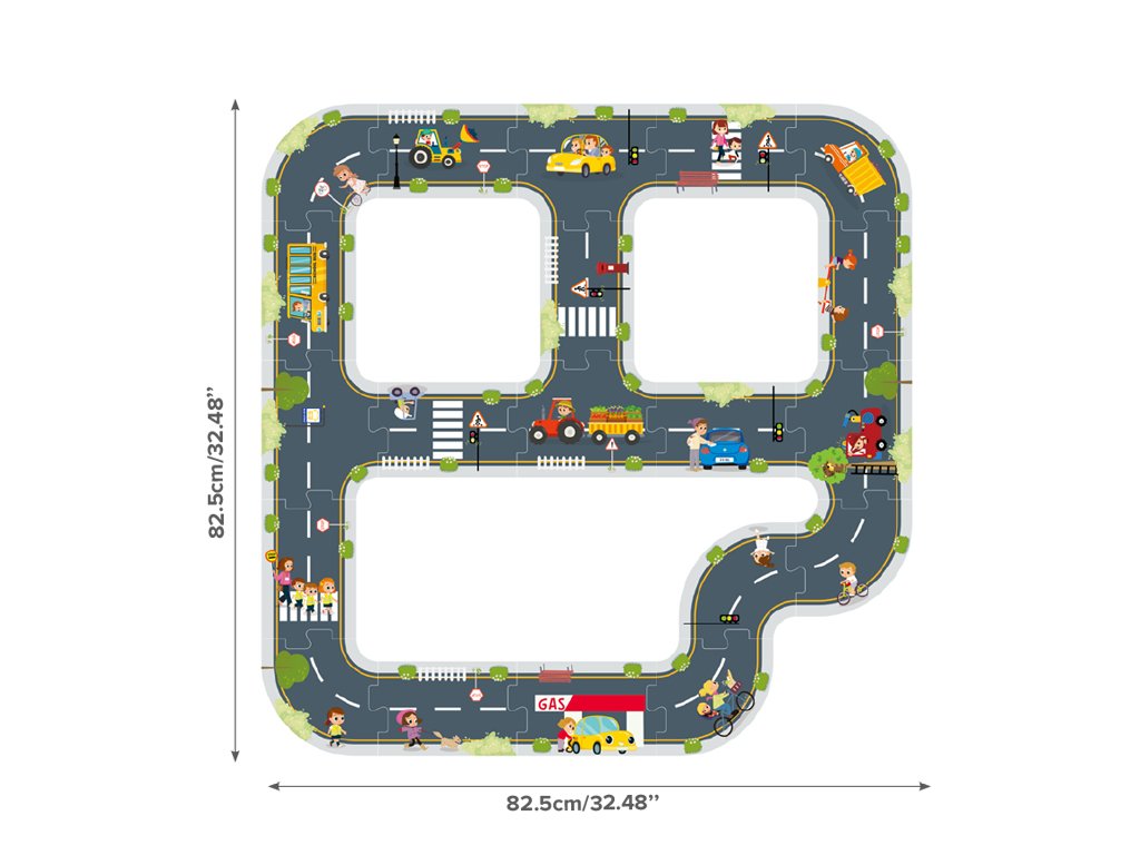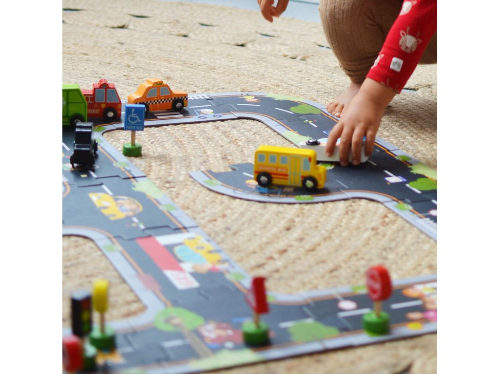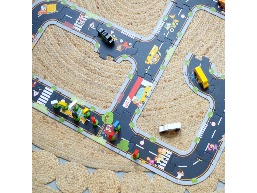 Puzzle road City Ein Hoch auf die Straße! Ein tolles Puzzle mit einem Stadtstraßenmotiv bringt Kindern stundenlangen Spaß. Zuerst trainieren sie ihr logisches Denken, indem sie die richtigen Puzzleteile zusammensetzen und finden, und dann hält die Autos nichts mehr davon ab, durch die actionreichen Straßen der Stadt zu fahren. Die Packung enthält 20 Puzzleteile und eine Inspirationshilfe, während des Spiels trainieren die Kinder ihre Feinmotorik, und das Spielen zu zweit fördert auch die sozialen und kommunikativen Fähigkeiten. Die Autos sind nicht enthalten.Zusätzliche Parameter