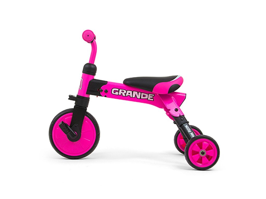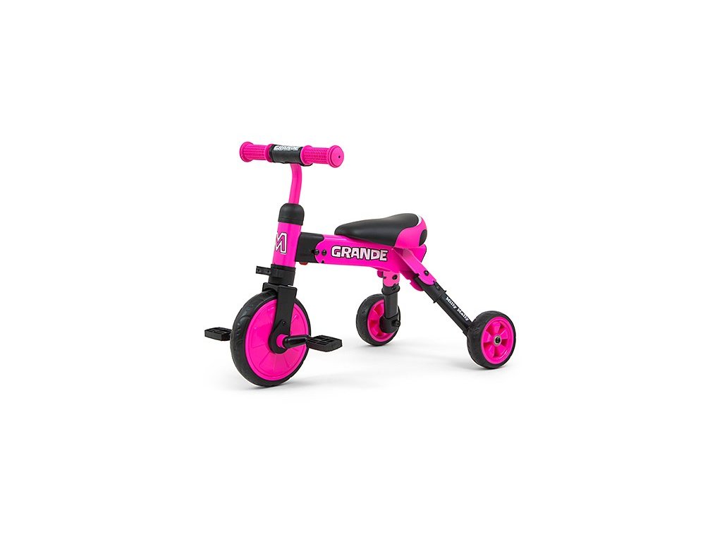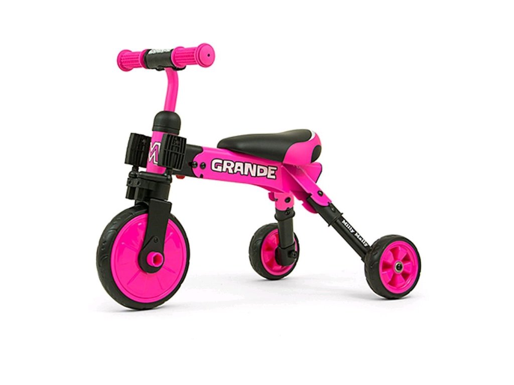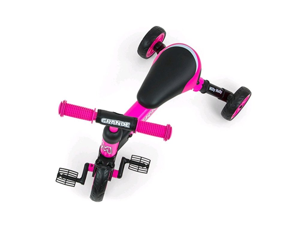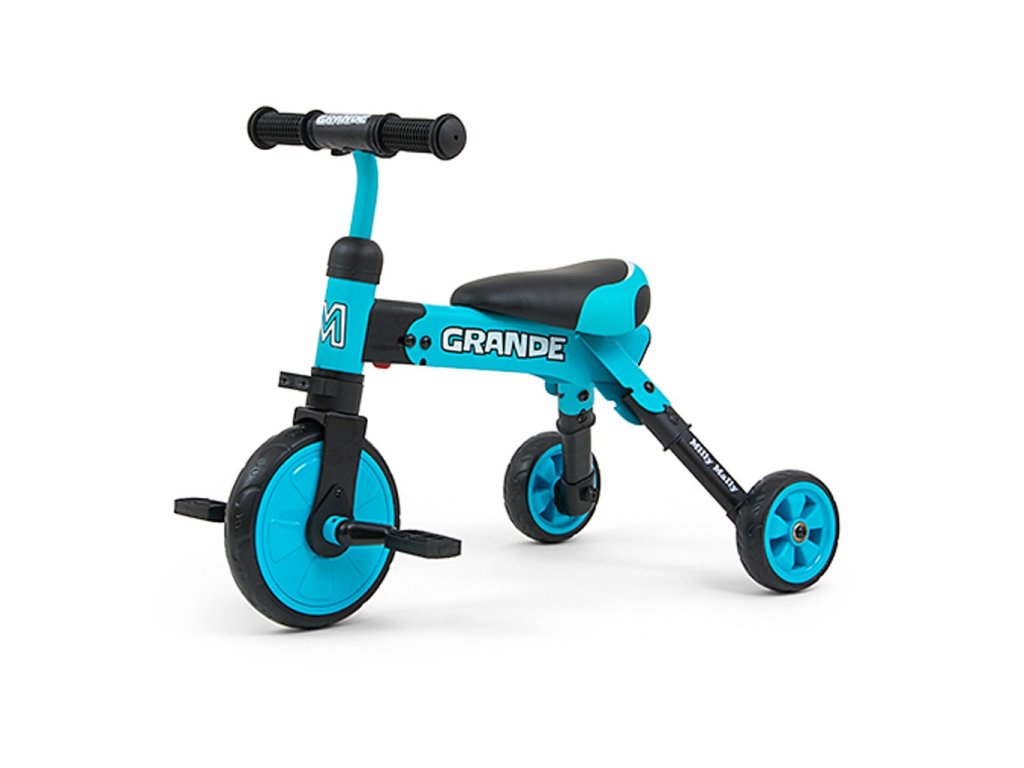 Kompaktná detská šliapacia trojkolka Milly Mally 2v1 Grande je ideálnym riešením pre deti, ktoré sa práve začínajú učiť jazdiť na bicykli a pritom ešte nie sú schopné udržať rovnováhu na dvoch kolesách. Je vyrobená z kvalitných a odolných materiálov a je ideálna na prechádzky. Veľkou výhodou tejto trojkolky je jednoduchá montáž pedálov a ľahké zloženie celej trojkolky. Penové kolesá výborne absorbujú nárázy, poskytujú dobrú priľnavosť, zaistia pohodlie počas jazdy a neunavia vášho malého pretekára. Dostatočná vzdialenosť kolies od seba poskytuje mimoriadnu stabilitu, bezpečnosť počas používania doma i vonku. Mäkké a nekĺzavé rukoväte zaistia pevné držanie riadidiel. Doraz nedovolí pretočenie riadidiel.