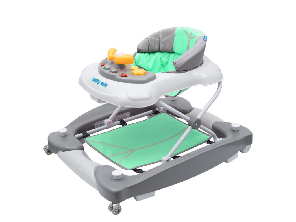 Detské chodítko s hojdačkou Baby Mix vo veselých farbách so štyrmi siikónovými kolieskami. Chodítko je nastaviteľné do niekoľkých polôh a má veľmi pohodlný poťah, ktorý možno vyprať a je v zadnej časti vystužený. Hrací pultík je vybavený volantom, ktorý píska a možno ním otáčať, kvetinka, hrkálka, dve tlačidlá, ktoré hrajú melódie a dve svetielka. Chodítko možno veľmi jednoduchým spôsobom zmeniť na hojdačku. Vyrobené z kvalitného plastového materiálu. Rozmery cca 75x70 cm. Batérie nie sú súčasťou balenia. Nosnosť do cca 12 kg.Dodatočné parametre