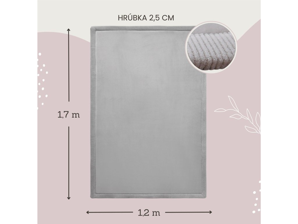 Detský koberec Light Grey 1.7 x 1.2 m Bezpečné a pohodlné miesto na hranie Detský koberec Light Grey je skvelým miestom pre deti na hranie, lezenie aj oddych. Má tri vrstvy – mäkký koralový zamat, pohodlnú elastickú pamäťovú penu a protišmykovú podložku, ktoré zaručia bezpečné a pohodlné hranie na zemi. Pamäťová pena je hrubá 2 cm a rýchlo sa vracia do pôvodného tvaru, čo je výhodou oproti lacnejším kobercom. S rozmermi 170 x 120 x 2 cm je dostatočne veľký nielen na detské hry, ale aj na jogu alebo relax.Štýlový a praktický doplnok do domácnosti Detský koberec sivej farby krásne doplní váš interiér. Jeho praktický dizajn umožňuje jednoduchú starostlivosť a ľahkú údržbu – stačí ho povysávať alebo utrieť vlhkou handričkou. Navyše, je vyrobený bez škodlivých látok ako sú BPA či ftaláty, takže si môžete byť istí, že vaše dieťa bude v bezpečí.Dodatočné parametre