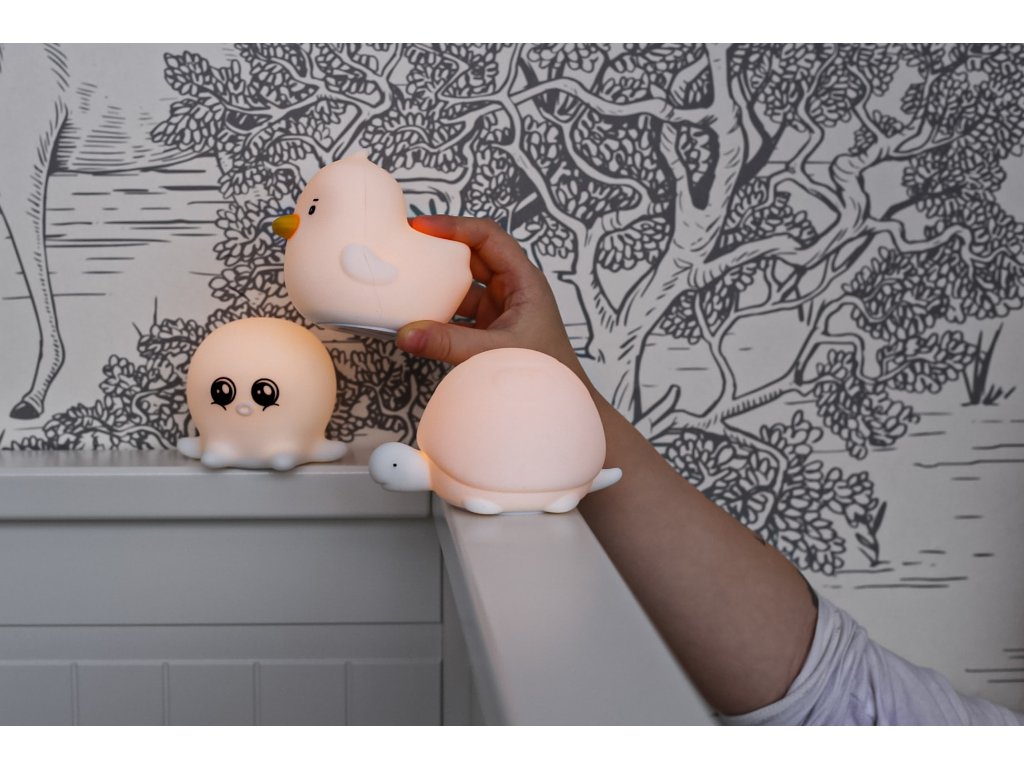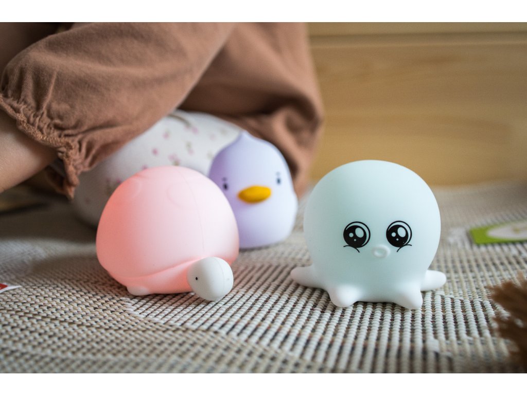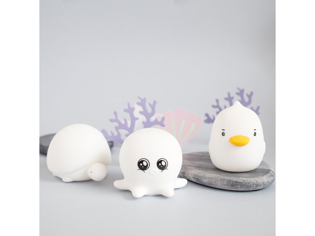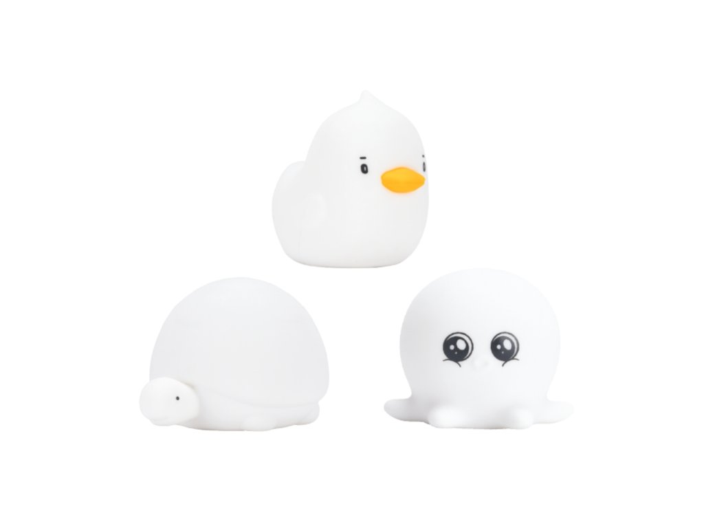 Dotykové svetielka do vody 3 ks Korytnačka, kačka, chobotnica Svietiace hračky do vane aj do detskej izbičky 3 dotykové svetielka do vody v tvare korytnačky, kačky a chobotnice majú pre dieťatko viacero využití. Poslúžia ako jedinečná dekorácia do detskej izby, ako nočné svetielko, keď sa dieťatko potrebuje napiť alebo ísť do kúpeľne a môžu ho sprevádzať aj počas kúpania ako svietiace hračky do vane. Vodotesnosť svetielok umožňuje ponoriť ich do vody až do hĺbky 1 metra po dobu max. 30 minút.Svietia v 7 rôznych farbách Lampičky majú senzory, ktoré detegujú dotyk alebo pohyb a aktivujú svetlo. Vďaka tomu bude mať dieťatko tlmené teplé svetlo v izbičke, keď v noci vstane z postele. Poklepaním na silikónový povrch sa zmení farba svetla. Po zapnutí sa lampa automaticky vypne po minúte nečinnosti.Vlastnosti:- 3 ks v cene- Vodotesnosť IP67- mäkký a na dotyk príjemný silikón bez BPA- ovládanie dotykom- svietia 7 farbami- režim spánku po 60 sekundách- 1 batéria vystačí na cca 15 hodín plného svietenia- napájané batériami CR2032 (9 ks je súčasťou balenia)- nezohrievajú sa- ľahko sa čistiaDodatočné parametre