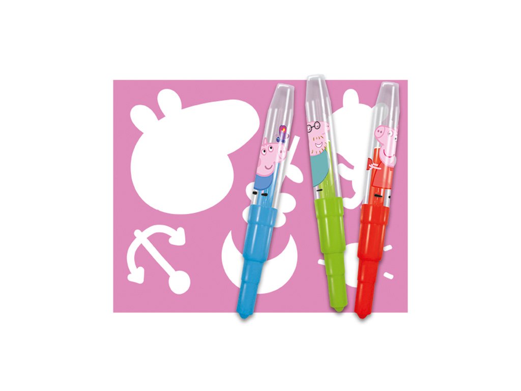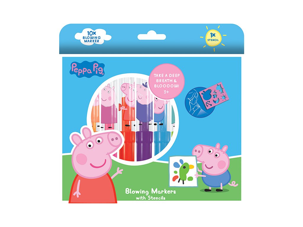 Fúkacie fixky Peppa Pig 10 ks Tvor so svojimi obľúbenými hrdinami Zaži kreatívnu zábavu s obľúbenými postavičkami z rozprávky Peppa Pig! Fúkacie fixky prinášajú deťom originálny spôsob maľovania – stačí zafúkať a farba sa prenesie na papier ako sprej. Balenie obsahuje 10 farebných fixiek s potlačou obľúbených postavičiek a 1 šablónku, vďaka ktorej si deti môžu vytvoriť vlastné obrázky. Skvelá aktivita na rozvoj kreativity, jemnej motoriky a predstavivosti. Ideálne ako darček alebo doplnok k omaľovánkam.Dodatočné parametre