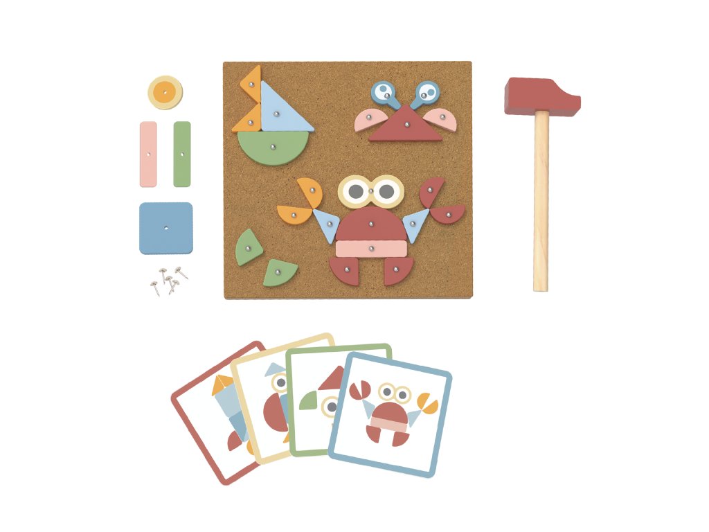 Hra s kladivkom Tvary Pastel Deti si poskladajú jedinečné obrázky Hra s kladivkom v nežných pastelových farbách od Tooky Toy obsahuje 82 dielikov. Deti tak majú veľa priestoru na tvorenie. Vďaka drevenému kladivku a malým klinčekom na korkovej podložke vytvárajú najrôznejšie farebné obrázky z drevených tvarov. Koláže tvoria podľa predlohových kartičiek alebo podľa svojej vlastnej fantázie.Sada podporuje kreativituDeti si precvičia aj jemnú motoriku a schopnosť pracovať podľa predlohy. Je to kreatívna sada aj stavebnica zároveň. Set obsahuje 30 drevených dielikov s dierkami, z ktorých si deti môžu vymyslieť, čo len chcú, korkovú podložku, drevené kladivko, predlohy a 35 klinčekov (pripináčiky). Vhodné pre deti od 4 rokov.Dodatočné parametre