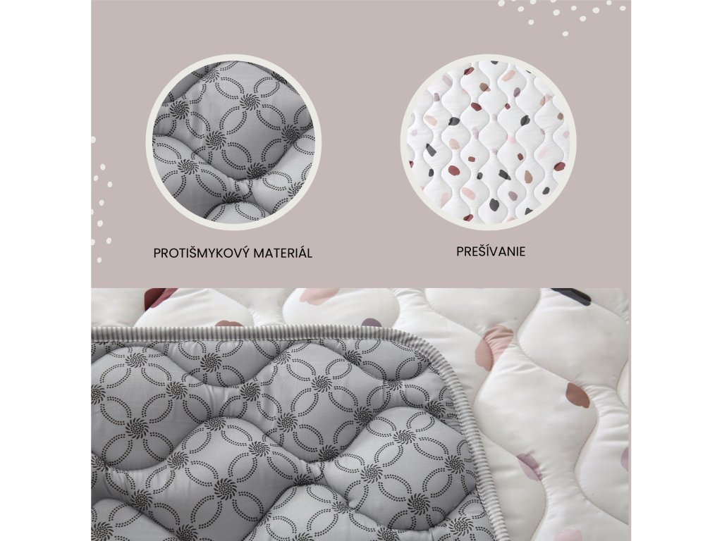 Hracia podložka prešívaná Confetti 1.27 x 1.27 m Štýlová a praktická podložka Štýlová a praktická hracia podložka v krásnom konfetovom prevedení dokonale zapadne do obývačky alebo detskej izby a zároveň zabaví vaše bábätko. Nádherné, jemné pastelové farby podložky vytvoria útulné, ale aj bezpečné miesto na hranie a lezenie. Protišmykový povrch zaručuje bezpečnosť pri každej hre, takže vaše dieťatko môže objavovať svet bez obáv.Flexibilná podložka nielen na hranie Skladacia podložka s hrúbkou 1,5 cm ponúka dostatok priestoru nielen pre hranie bábätiek, ale aj pre rôzne rodinné aktivity. Využijete ju aj na jogu, športové cvičenia či dokonca piknik v prírode. Navyše, hracia podložka sa veľmi ľahko čistí a je vyrobená z mäkkej polyesterovej tkaniny šetrnej k pokožke.Dodatočné parametre