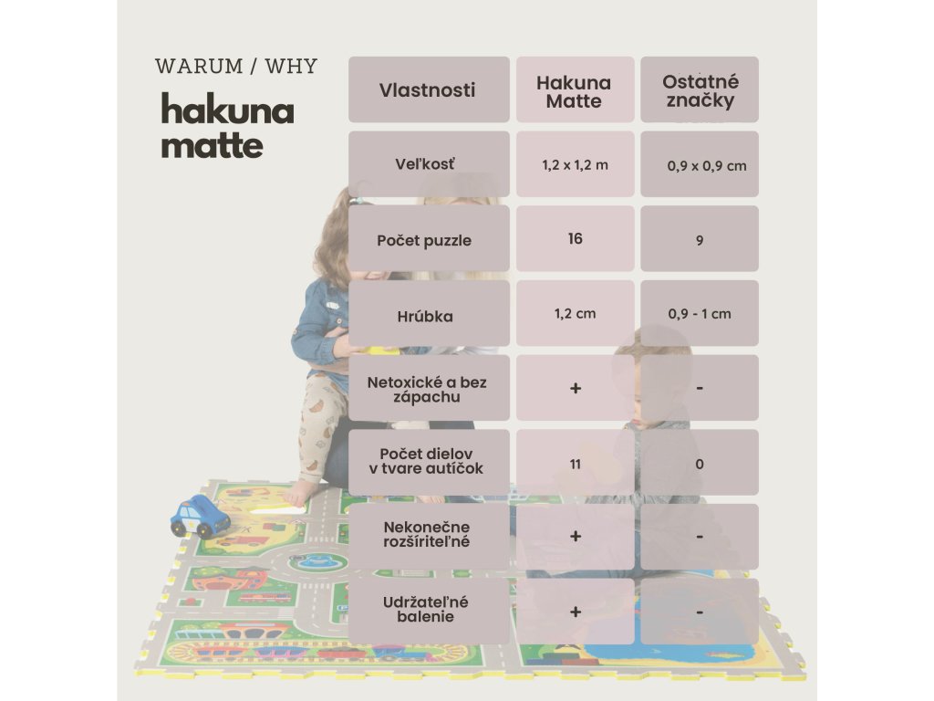 Hracia podložka Puzzle Mesto 1.2 x 1.2 m Vytvorte si fantastické puzzle mesto Zažite dobrodružstvo v úžasnom Puzzle Meste. Tento hravý koberec pozostáva zo 16 puzzle dielov, ktoré vytvárajú pestré cesty a budovy ako štadión, nemocnica, stavenisko a prístav. Deti sa môžu zabávať s 11 odnímateľnými tvarmi vozidiel, ktoré slúžia ako skvelé hračky na hranie. Vytvorte si vlastné mesto plné dobrodružstva a objavovania, kde si deti môžu rozvíjať svoju kreativitu a motorické zručnosti.Bezpečná zábava pre najmenších Hracia podložka Puzzle Mesto je vyrobená z kvalitnej EVA peny, ktorá je hrubá 1,2 cm a o 20% mäkšia a teplejšia ako iné alternatívy, čo zabezpečuje pohodlné a bezpečné hranie. Podložka je vodeodolná a jednoducho ju vyčistíte mydlom a handričkou, takže ju môžete používať nielen doma, ale aj vonku. Navyše, je 100% bez zápachu a neobsahuje nebezpečné látky ako formamid, BPA a ftaláty. Puzzle Mesto môžete rozšíriť o ďalšie puzzle koberce a vytvoriť tak ešte väčšie miesto na hranie.Dodatočné parametre