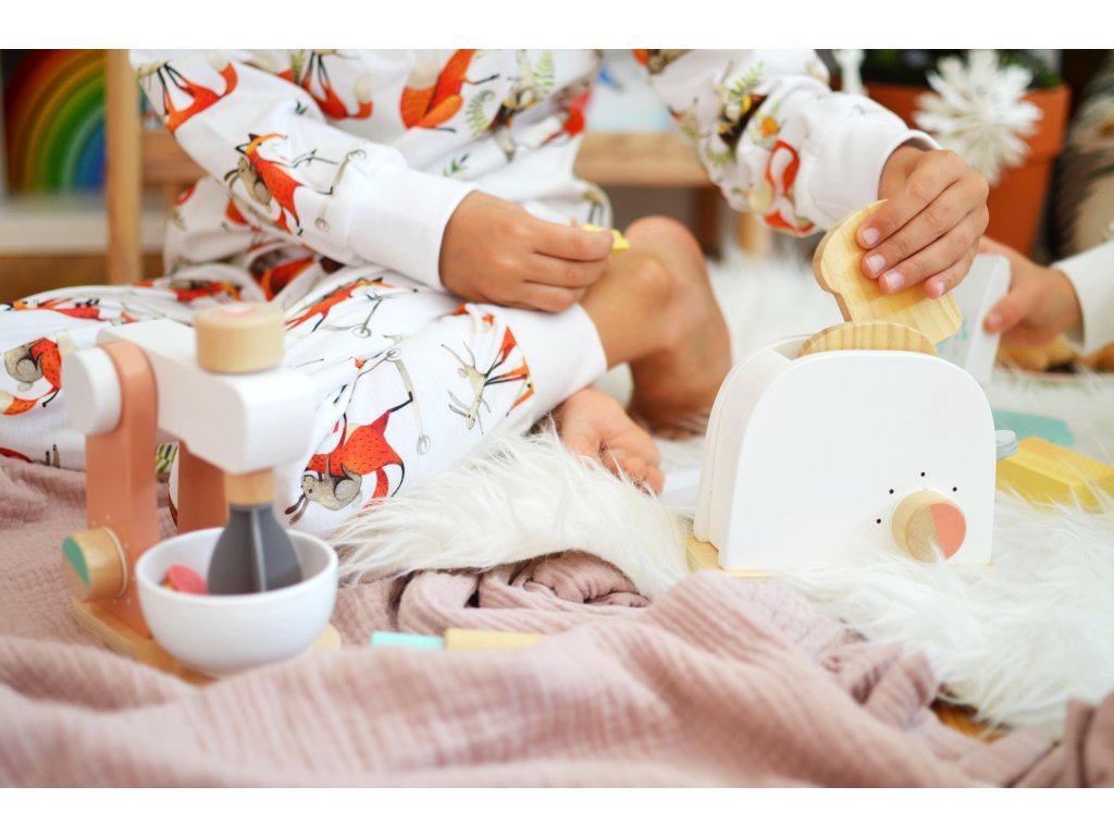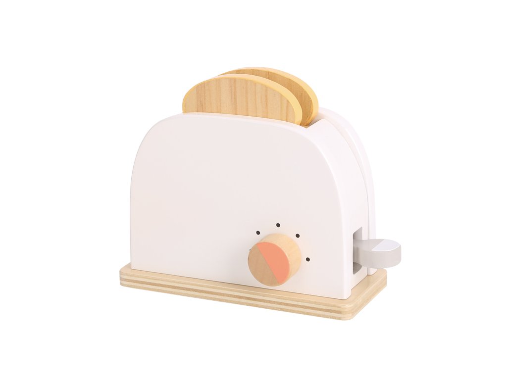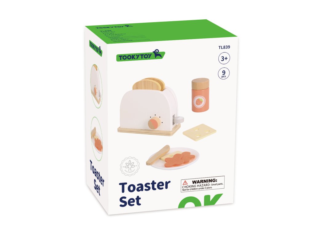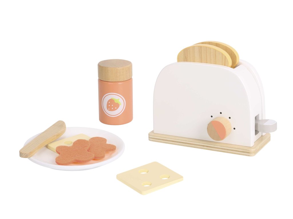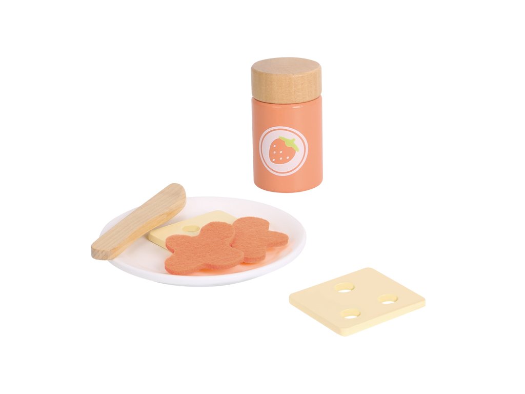 Hriankovač s príslušenstvom Príprava raňajok bude ešte väčšia zábava. Krásna drevená sada je skvelým doplnkom do každej detskej kuchynky. Deti si najskôr opečú toast, potom si naňho dajú plátok syra a raňajky sú hotové. Set obsahuje hriankovač, 2 toasty, 2 syry, tanierik, nožík a jahodový džem s tubou.Páčka na hriankovači je mechanická. Hra rozvíja detskú fantáziu a sebavedomie. Deti si tiež cvičí jemnú motoriku a koordináciu oko-ruka. Set je vyrobený z kvalitného dreva a farieb, dlho vydrží a je zdravotne nezávadný.Dodatočné parametre