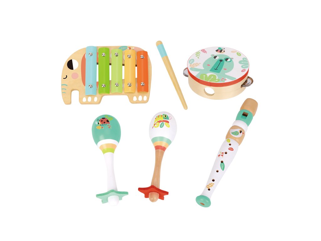 Zenei készlet ÁllatokA gyerekek megtanulják szeretni a zenét.A zenei készlet Állatok négy hangszerből és ritmusjátékból áll, amelyeket egy fadobozban tárolnak. Az egyes hangszerek imádnivaló állatok motívumaival és gyönyörű, egymáshoz illő színárnyalatokkal készültek. A készlet tartalmaz egy xilofont, rumba labdákat, fuvolát és tamburint.fejlesztik a koordinációt és az érzékszervi érzékelést.a hangszerek erősítik a gyermekek zenével való kapcsolatát és gyakorolják a gyermek ritmikai készségét. Fejlesztik a mozgáskoordinációs képességet és javítják a koncentrációt. A hangok különböző variációival való kísérletezéssel ösztönzik a gyermekek kreativitását.Kiegészítő paraméterek