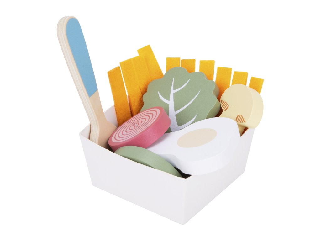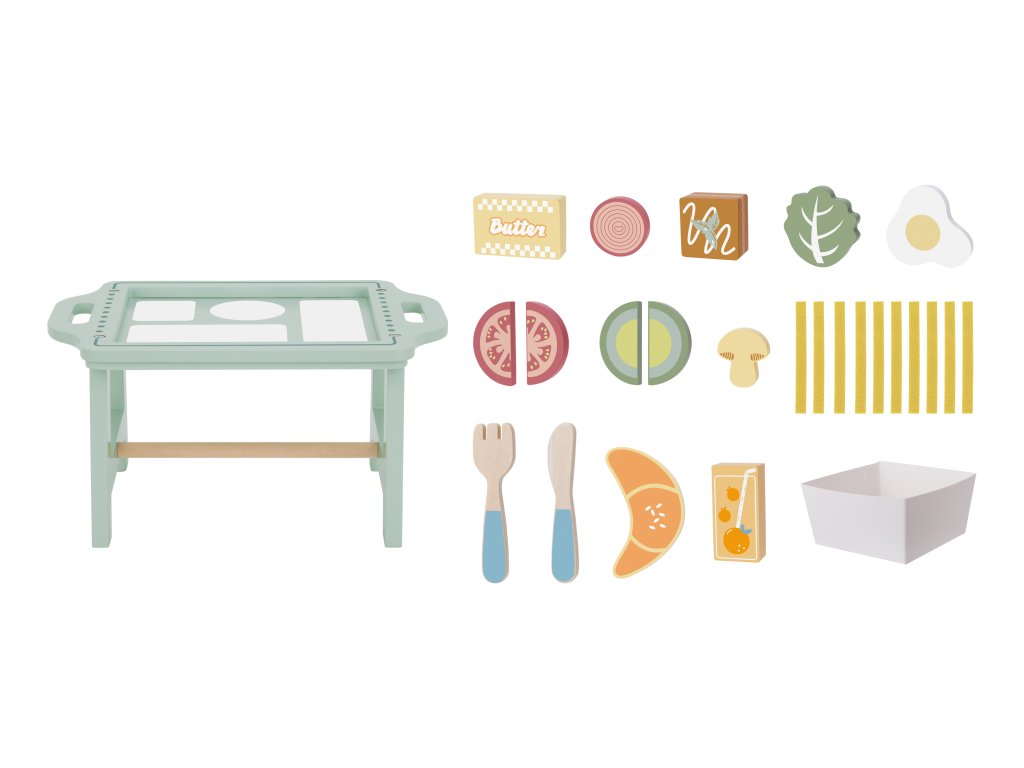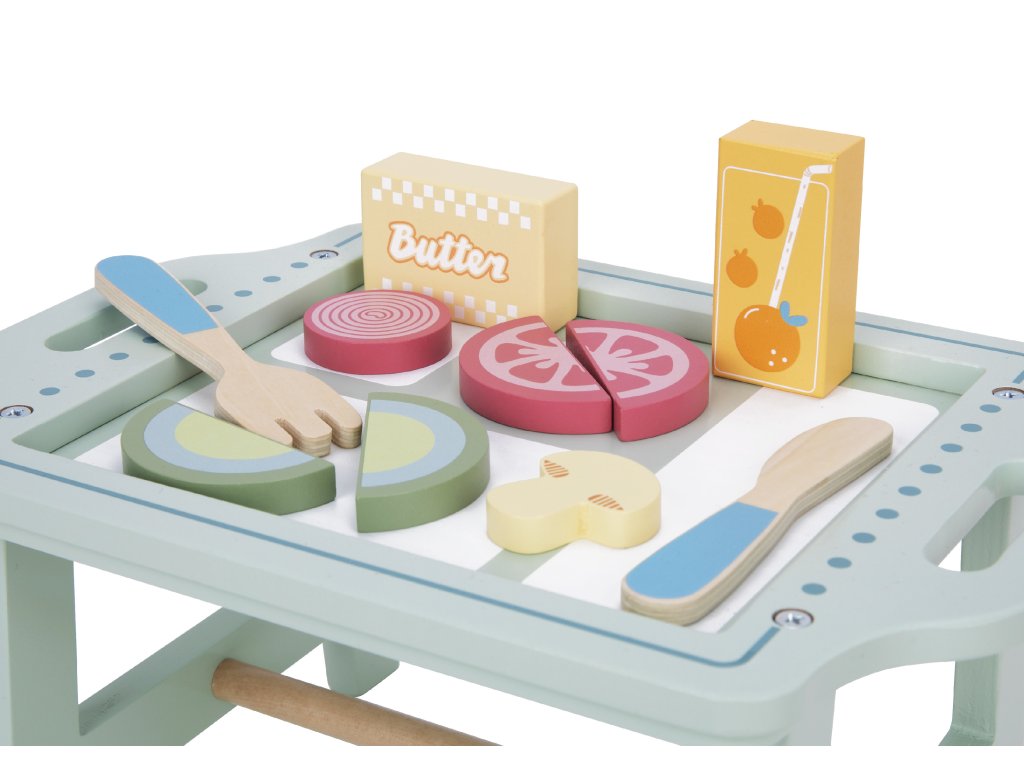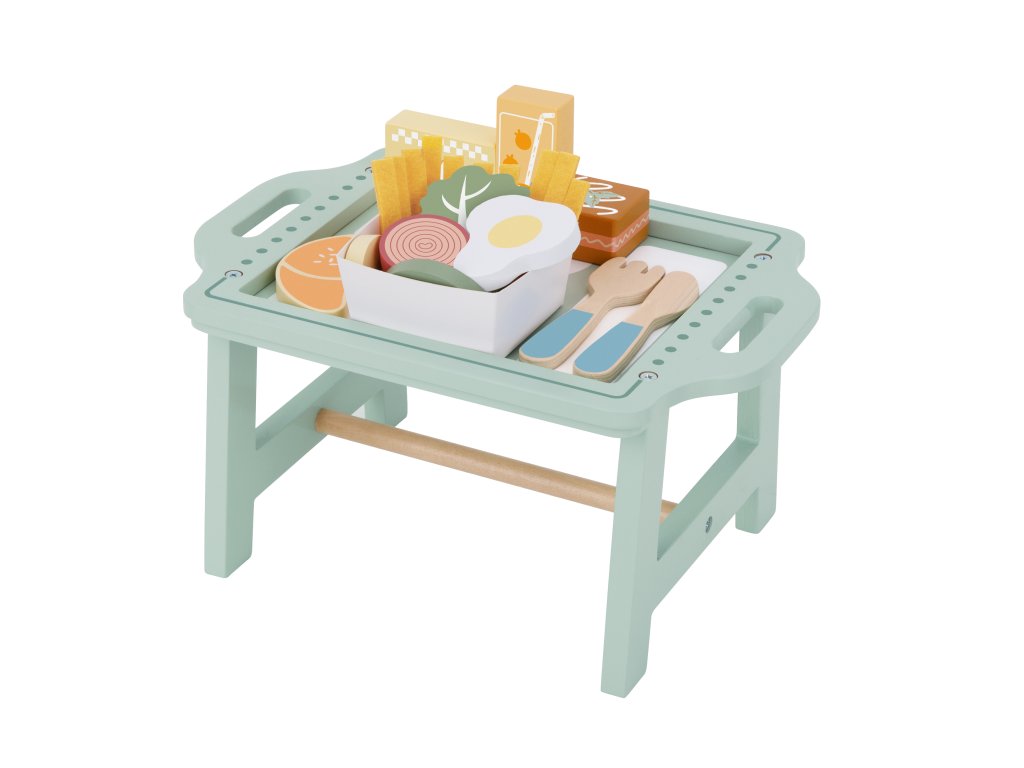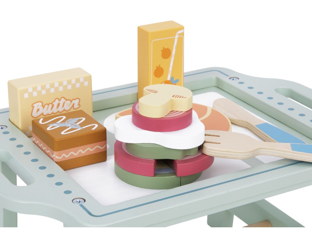 Pasztell színű reggeliző készletReggeli a kiságyban!A Tooky Toy elmaradhatatlan, pasztell színű, fából készült tálcája kiegészítőkkel gyerekeknek, amely remek játék a felnőtt szerepjátékhoz. A lábakkal ellátott, stabil tálca kis asztalként is szolgálhat, így a babaszoba és a gyermekkonyha kedves kiegészítője lesz. A tálcán kívül a csomagban a gyerekek további 25 darab fa ételt és kiegészítőt találnak, nem csak az egészséges reggeli elkészítéséhez. Vannak benne evőeszközök és keverőtál is. A tálca a két fogantyúnak köszönhetően hordozható.A gyerekek szociális készségeket fejlesztenekA fából készült tálca kiegészítőkkel segít a gyerekeknek a felnőttek játékán keresztül fejleszteni szociális készségeiket és kommunikációjukat. A gyerekek játék közben kreatívak lesznek, és pozitív hozzáállást sajátítanak el az ételkészítéshez. A Tooky Toy gyermekeknek szánt fajátékai erős, jól kezelt, fenntartható forrásból származó fából készülnek, és nem mérgező festékkel és lakkokkal vannak festve. A készlet nagyszerű ajándék 3 éves kortól.Kiegészítő paraméterek
