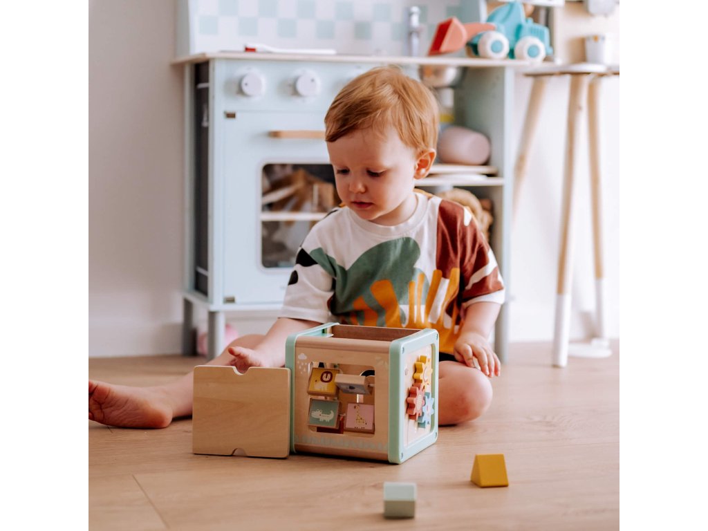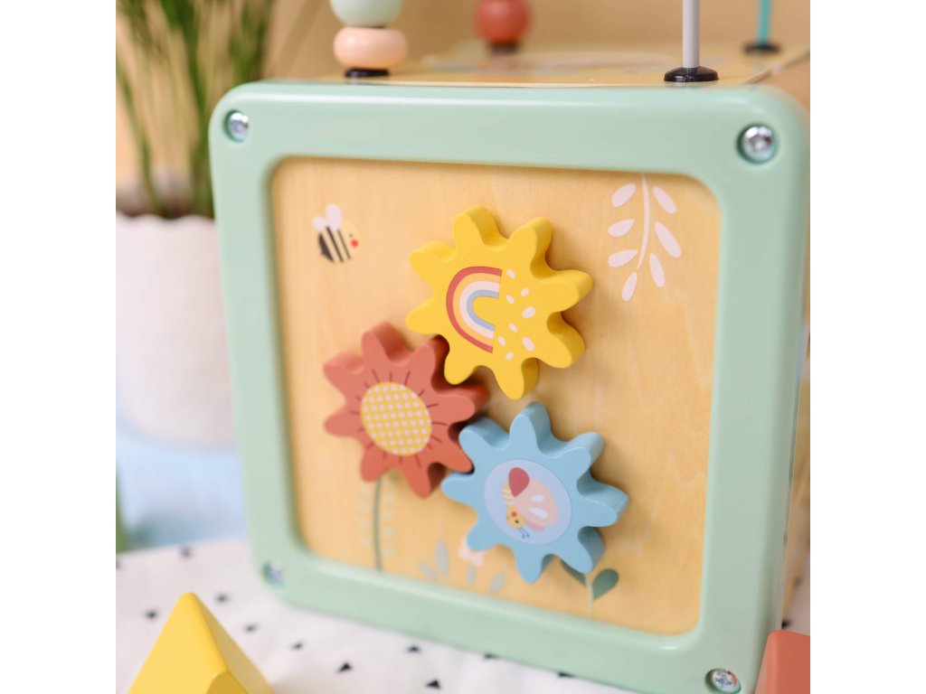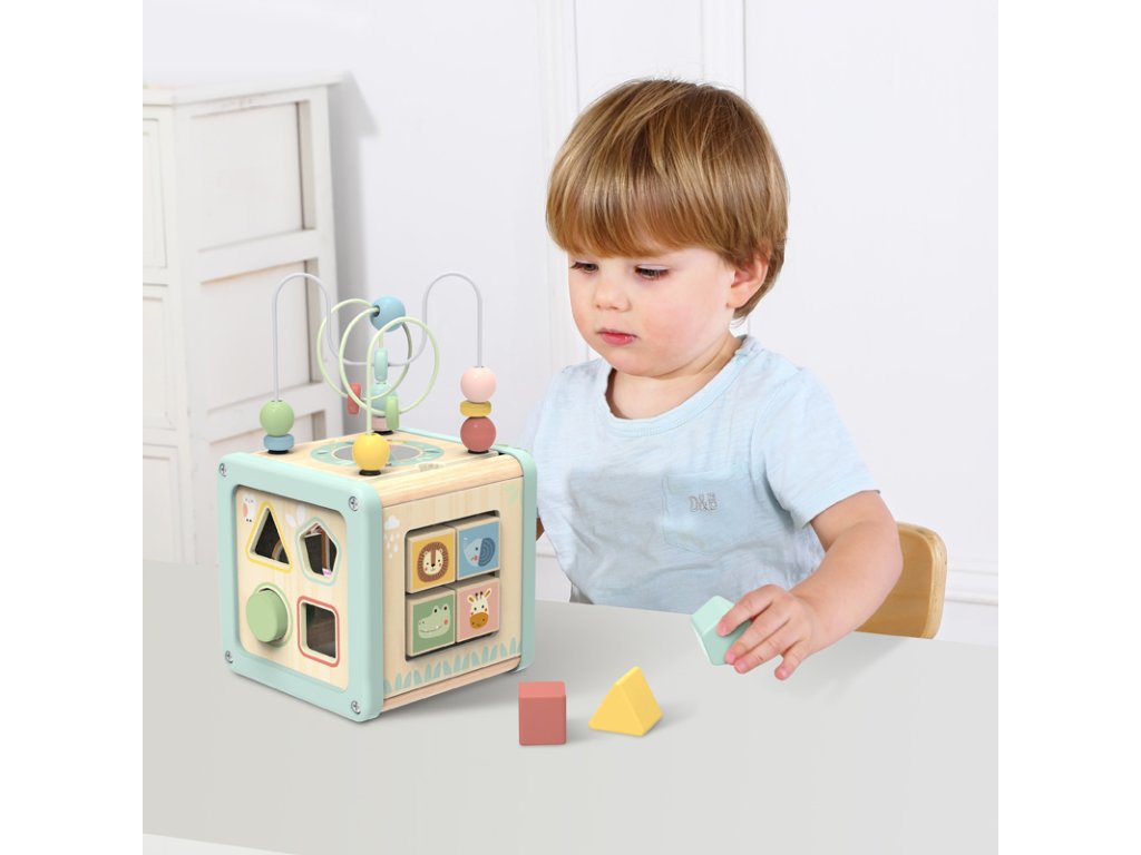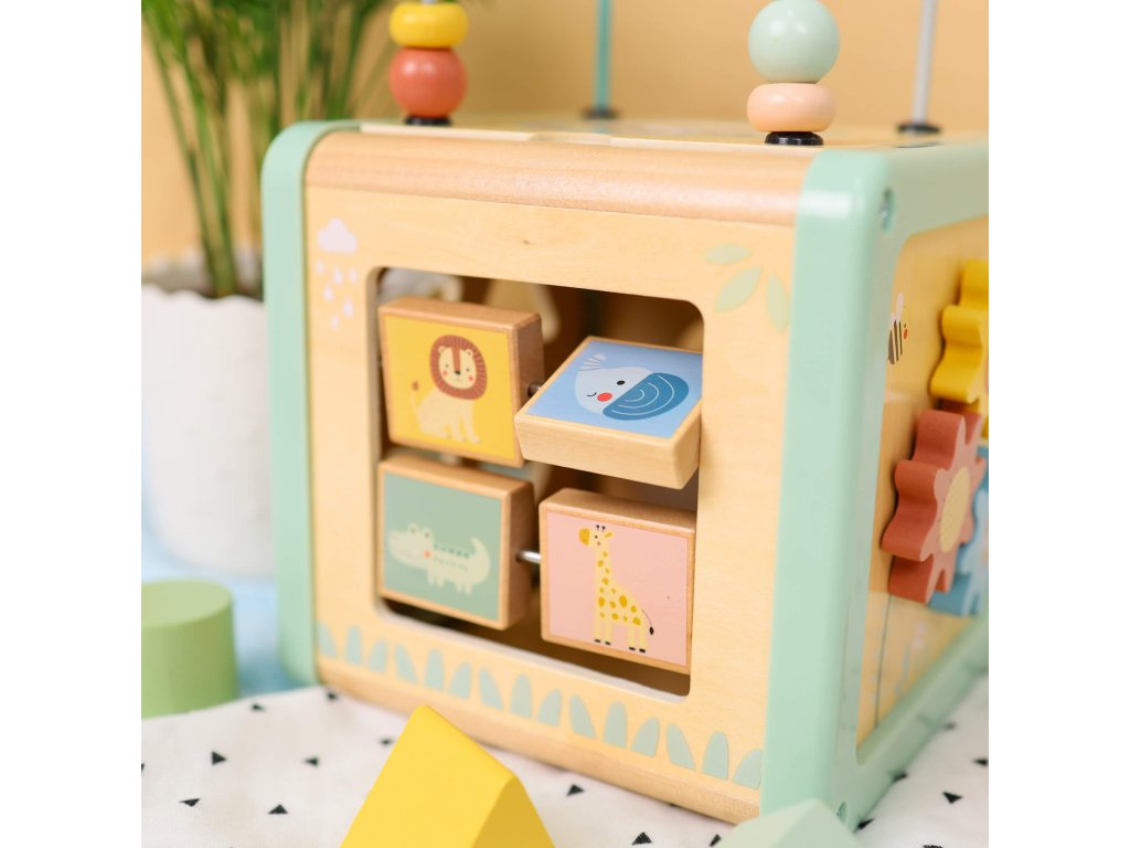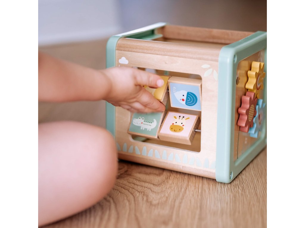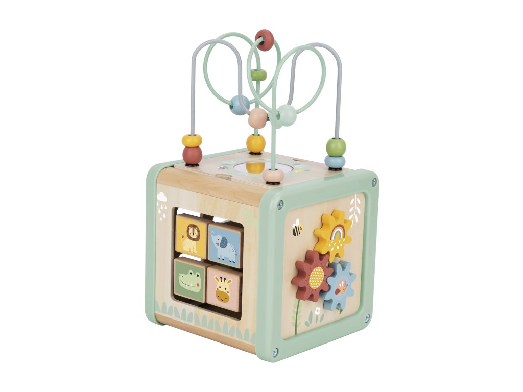 Kocka s aktivitami Lúka Pastel 5 motorických aktivít v jednom! Krásna drevená aktivity kocka s lúčnymi motívmi v nežných pastelových farbách od Tooky Toy sa stane zdrojom zmysluplnej zábavy pre vaše batoľatá. Obsahuje 5 rôznych motorických aktivít: bludisko so zvieratkami, vkladačku so 4 tvarmi, ozubené kolieska, otáčacie obrázky so zvieratkami, a motorický labyrint so zrkadielkom. Veko, na ktorom je upevnený labyrint aj zrkadlo, sa dá jednoducho zložiť a zase nabrať, aby si deti mohli z kocky jednoducho vyberať geometrické tvary.Motorická kocka podporuje rozvoj detí Vďaka tejto motorickej hračke si deti rozvíjajú kognitívne aj motorické zručnosti. Drevená kocka s aktivitami je preto skvelá ako zmysluplný darček pre deti. Motorické hračky pre deti Tooky Toy sú nápadité, vyrobené z prvotriedneho dreva z udržateľných zdrojov a majú netoxické farby a lak. Hračka je vhodná od 18 mesiacov.Dodatočné parametre