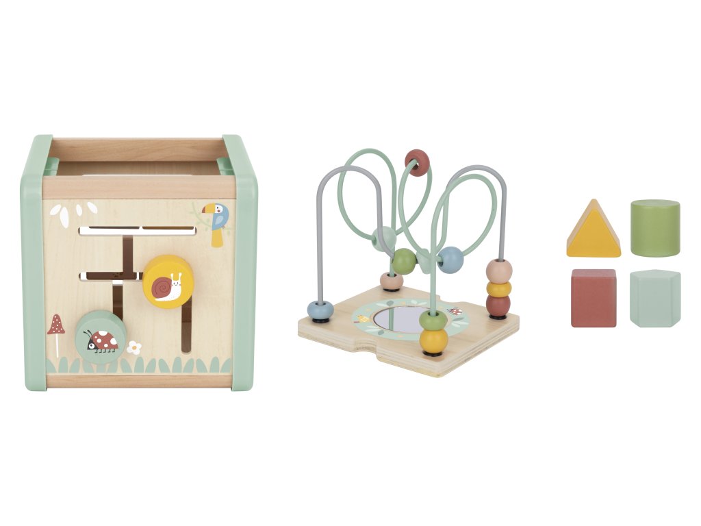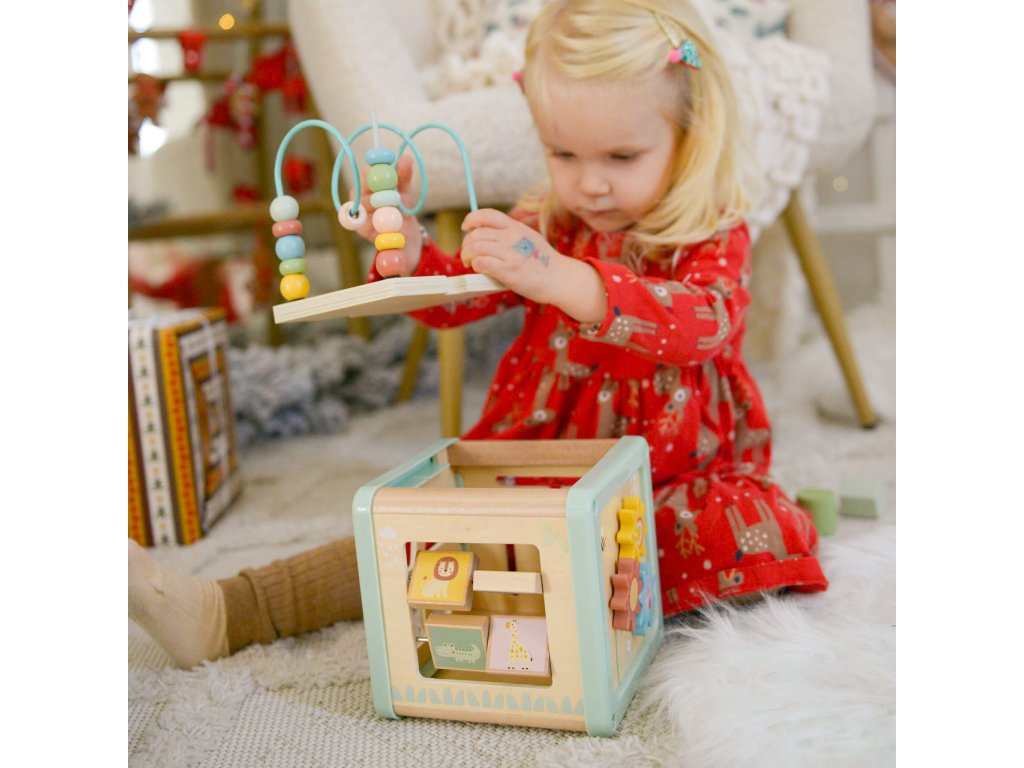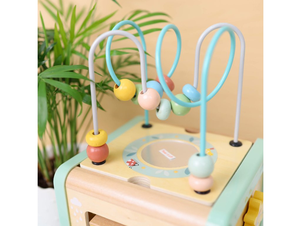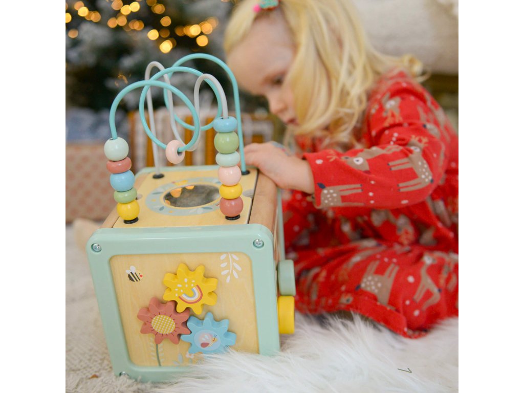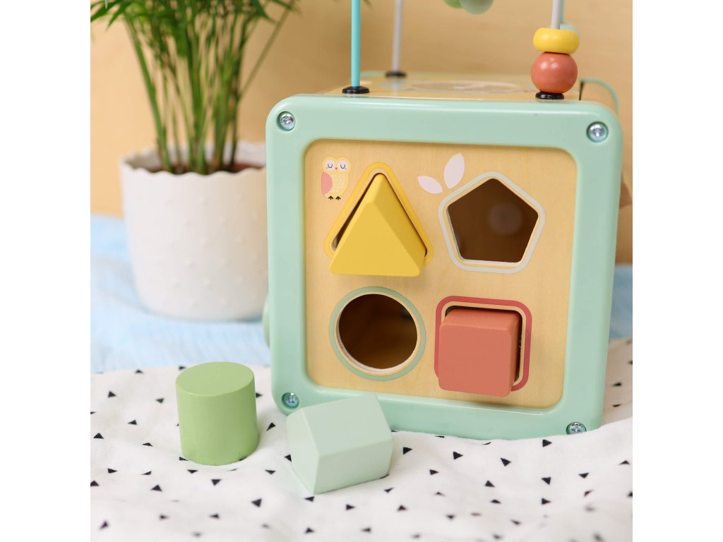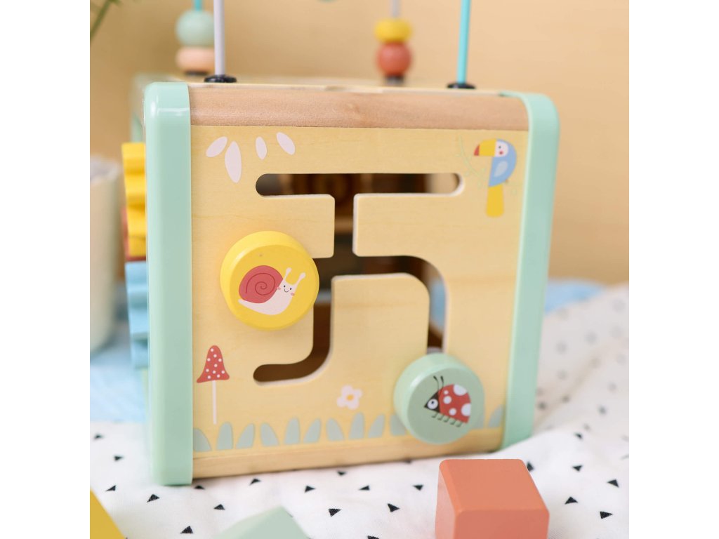 Kocka s aktivitami Lúka Pastel 5 motorických aktivít v jednom! Krásna drevená aktivity kocka s lúčnymi motívmi v nežných pastelových farbách od Tooky Toy sa stane zdrojom zmysluplnej zábavy pre vaše batoľatá. Obsahuje 5 rôznych motorických aktivít: bludisko so zvieratkami, vkladačku so 4 tvarmi, ozubené kolieska, otáčacie obrázky so zvieratkami, a motorický labyrint so zrkadielkom. Veko, na ktorom je upevnený labyrint aj zrkadlo, sa dá jednoducho zložiť a zase nabrať, aby si deti mohli z kocky jednoducho vyberať geometrické tvary.Motorická kocka podporuje rozvoj detí Vďaka tejto motorickej hračke si deti rozvíjajú kognitívne aj motorické zručnosti. Drevená kocka s aktivitami je preto skvelá ako zmysluplný darček pre deti. Motorické hračky pre deti Tooky Toy sú nápadité, vyrobené z prvotriedneho dreva z udržateľných zdrojov a majú netoxické farby a lak. Hračka je vhodná od 18 mesiacov.Dodatočné parametre