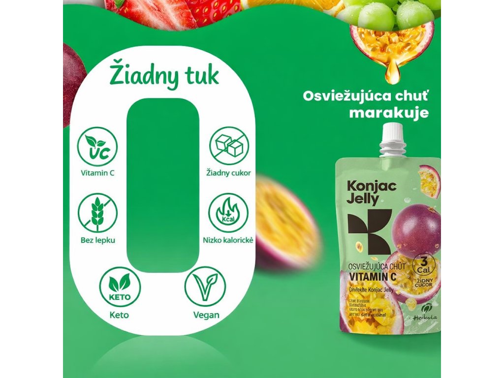 Konjac Jelly Marakuja je ľahký, nízkokalorický dezert vyrobený z konjacovej vlákniny (glucomannan), ktorá pomáha navodiť pocit sýtosti. Ideálny pre diéty, redukciu hmotnosti, low-carb a zdravý životný štýl.