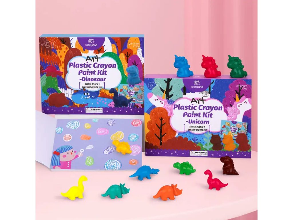 Kreatívna sada Prvé voskovky 2 v 1 Dinosaurus Voskovky pre najmenších v darčekovom balení Kreatívna sada 2 v 1 Dinosaurus od Tookyland je určená pre najmenších umelcov, ktorí sa ešte len zoznamujú s tvorením. V pevnom uzatvárateľnom boxe deti nájdu 12 nádherne farebných voskoviek v podobe roztomilých dinosaurov a 1 kreatívny zošit so 45 listov plný omaľovánok aj prázdnych papierov na kreslenie. Vďaka krásnemu baleniu je táto kreatívna sada vhodná pre najmenších ako darček k narodeninám, Vianociam či sviatku.Bezpečné a ergonomické voskovky Súprava pomôže deťom s rozvojom kreativity, tvorivosti, grafomotoriky i poznávaním farieb. Voskovky pre najmenších Dinosaurus sú úplne bezpečné a skvelé do malých ručičiek. Je jedno, ako ich deti uchopia, píšu z každej strany, nepatlajú sa na ruky a idú ľahko zmyť. Kreatívne potreby Tookyland sú bezpečné, navrhnuté odborníkmi priamo pre malé detské ruky a vyrábané s ohľadom na životné prostredie. Farby sú netoxické, dermatologicky testované, zmývateľné a dajú sa vyprať.Dodatočné parametre