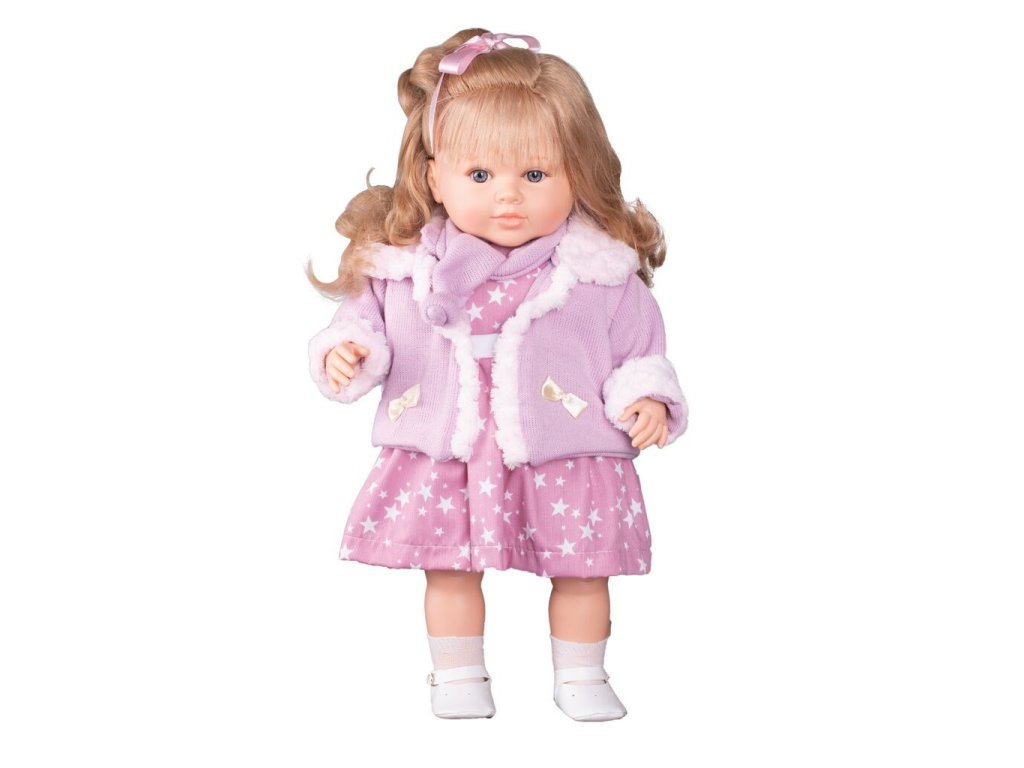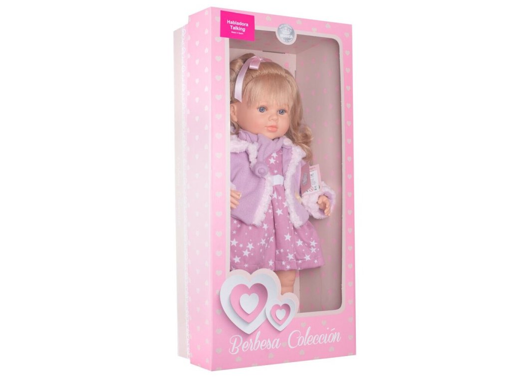 Luxusná hovoriaca španielska detská bábika-dievčatko Berbesa Kristýnka. Táto nádherná roztomilá bábika vyzerá skutočne ako živá. Bábika má mäkké látkové telo, gumové ručičky a nohy, prepracované do najmenších detailov. Bábika má na chrbte hrací modul, ktorý sa aktivuje po vybratí poistky. Stačí stlačiť bábike telíčko a bábika začne vydávať zvuk smejúceho sa dieťaťa a hovoriť "mama" a "papá". Tento zvuk sa sám vypne po jednom cykle. Bábika má modré oči, mihálnice a nádherné svetlé a husté vlásky. Súčasťou bábiky je fialový kabátik, hviezdičkové šatôčky, biele kraťasky, šál a ponožky s bielymi topánočkami. Oblečenie sa dá vyzliecť. Telíčko bábiky má jemnú vôňu po vanilke. Dĺžka bábiky je cca 52 cm. Vhodné pre deti od 3 rokov. Pri výrobe sú používané výhradne kvalitné materiály. Batérie sú súčasťou hracieho modulu.Dodatočné parametre