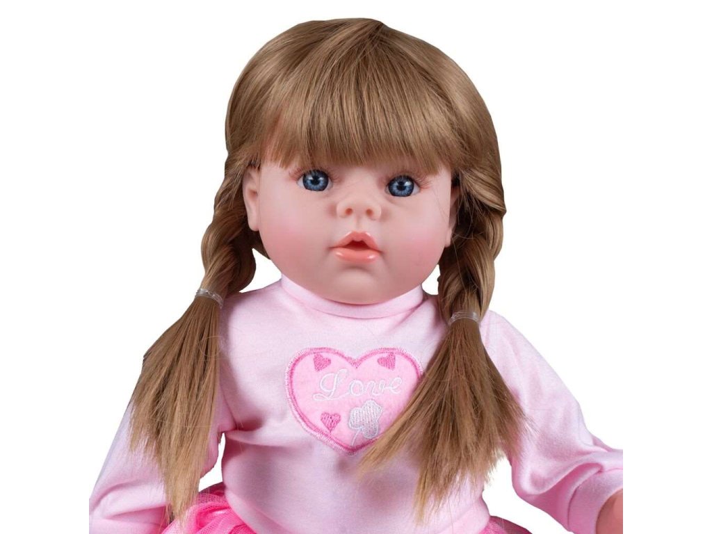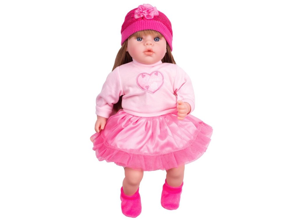 Krásna detská bábika PlayTo Tina. Skvelá hračka pre každé dievčatko, ktoré bude mať svoje hovoriace bábätko. Hlava, ruky a nohy sú vyrobené z gumy, telíčko potom z mäkkého materiálu, vďaka čomu sa môže dieťa k bábike krásne pritúliť. Bábika má milú tváričku, získa si srdce dievčatka svojimi modrými kukadlami a ružovými perami. Má roztomilé oblečenie, ako je tylová suknička, tričko s nápisom, ponožky a čiapočka. Oblečenie je možné vyzliecť a vyprať. Dĺžka bábiky je 46 cm a je zabalená vo farebnej krabici a je vhodná aj ako milý darček. Tina sa stane najlepšou kamarátkou vášho dievčatka. Bábika má maďarsky hovoriaci modul, ktorý sa nachádza v kapsičke na brušku. Modul po stlačení prehráva 5 piesní a hovorí 14 maďarských viet.Bábika spieva tieto maďarské pesničky: