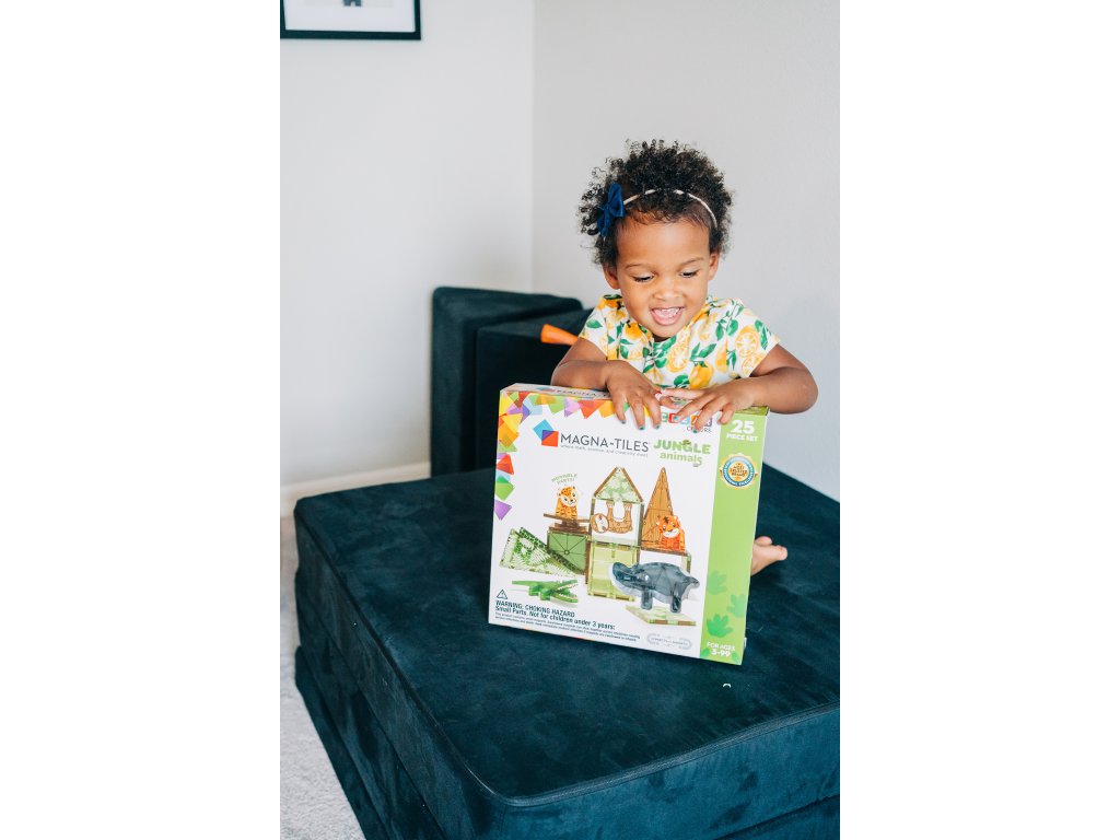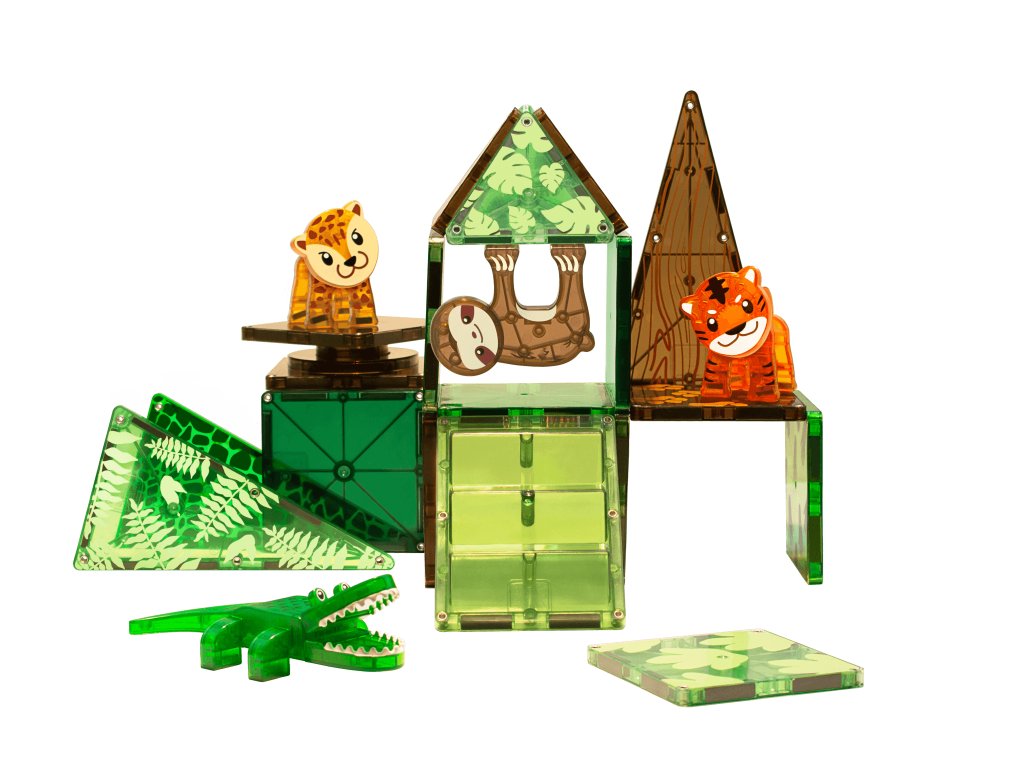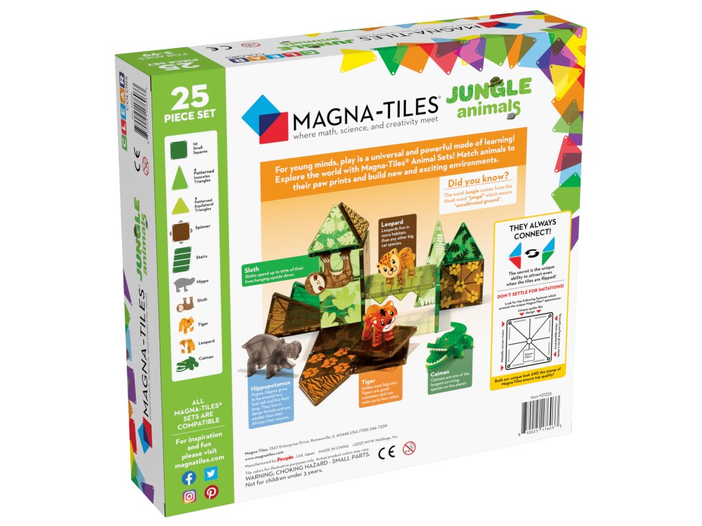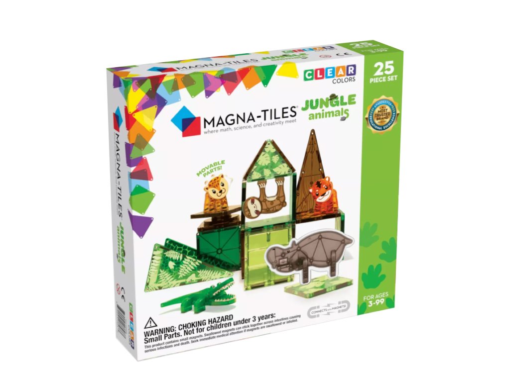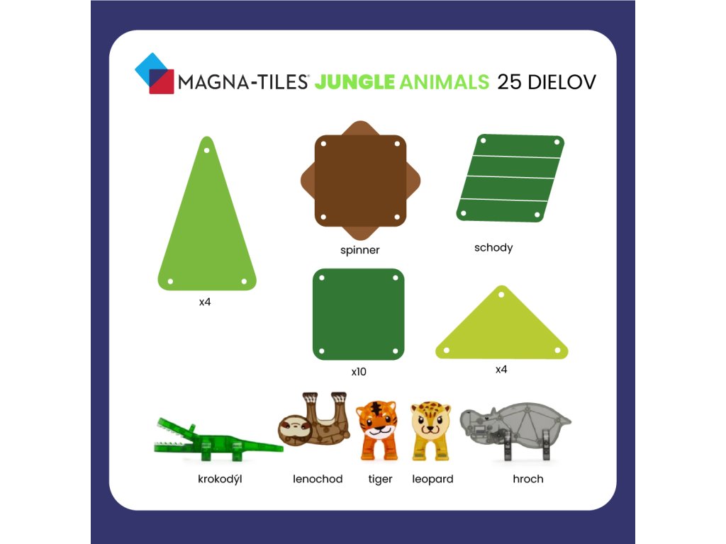 Magnetická stavebnica Jungle 25 dielov Preskúmajte úžasný svet džungle Úžasná magnetická stavebnica MAGNA-TILES® Jungle prináša hodiny nápaditej a sústredenej zábavy. Obsahuje päť magnetických zvieratiek z džungle (hroch, leňochod, tiger, leopard a aligátor) s pohyblivými časťami, ktoré sú pripravené preskúmať divoký prales. Deti sa navyše naučia fakty o zvieratkách, ktoré v tomto záhadnom svete žijú. Všetky diely sú plne kompatibilné a dopĺňajú sa so všetkými ostatnými súpravami MAGNA-TILES.Zmysluplná stavebnica pre malých staviteľov MAGNA-TILES je zástancom zmysluplnej hry, to znamená zábavnej a pútavej, no zároveň založenej na rozvíjaní detských zručností. Táto stavebnica podporuje rozvoj koordinácie ruka-oko, jemnej motoriky a logického myslenia prostredníctvom skúmania príčiny a následku. Bezpečnosť a špičková kvalita sú zaistené použitím potravinárskeho, netoxického plastu MABS bez BPA, ftalátov a latexu. Pevná konštrukcia dielikov zabraňuje praskaniu a udržiava magnety bezpečne na svojom mieste.Sada obsahuje 25 magnetických dielikov:5x figúrka - hroch, leňochod, tiger, leopard a aligátor,10x štvorec,4x rovnostranný trojuholník,4x, rovnoramenný trojuholník,1x spinner,1x schodisko.Dodatočné parametre