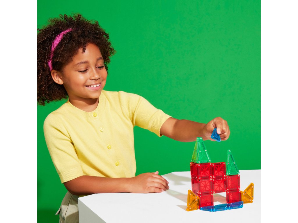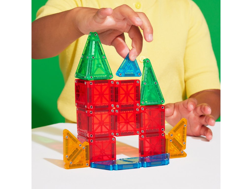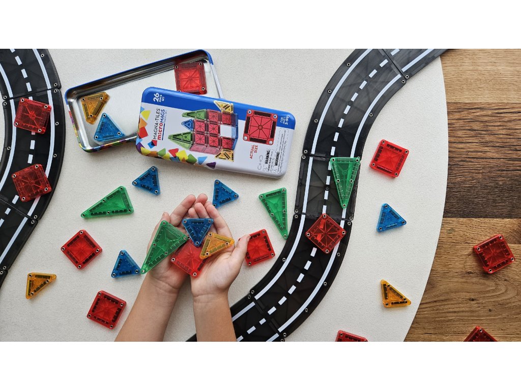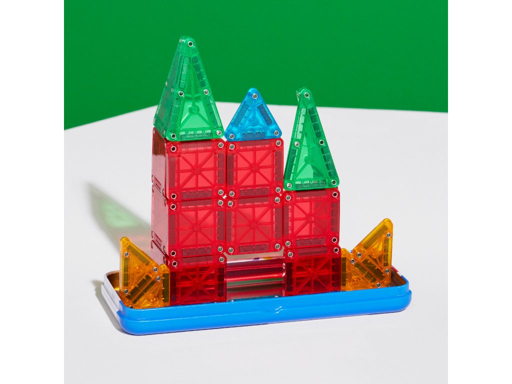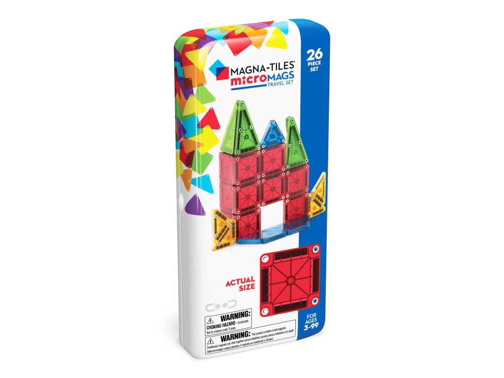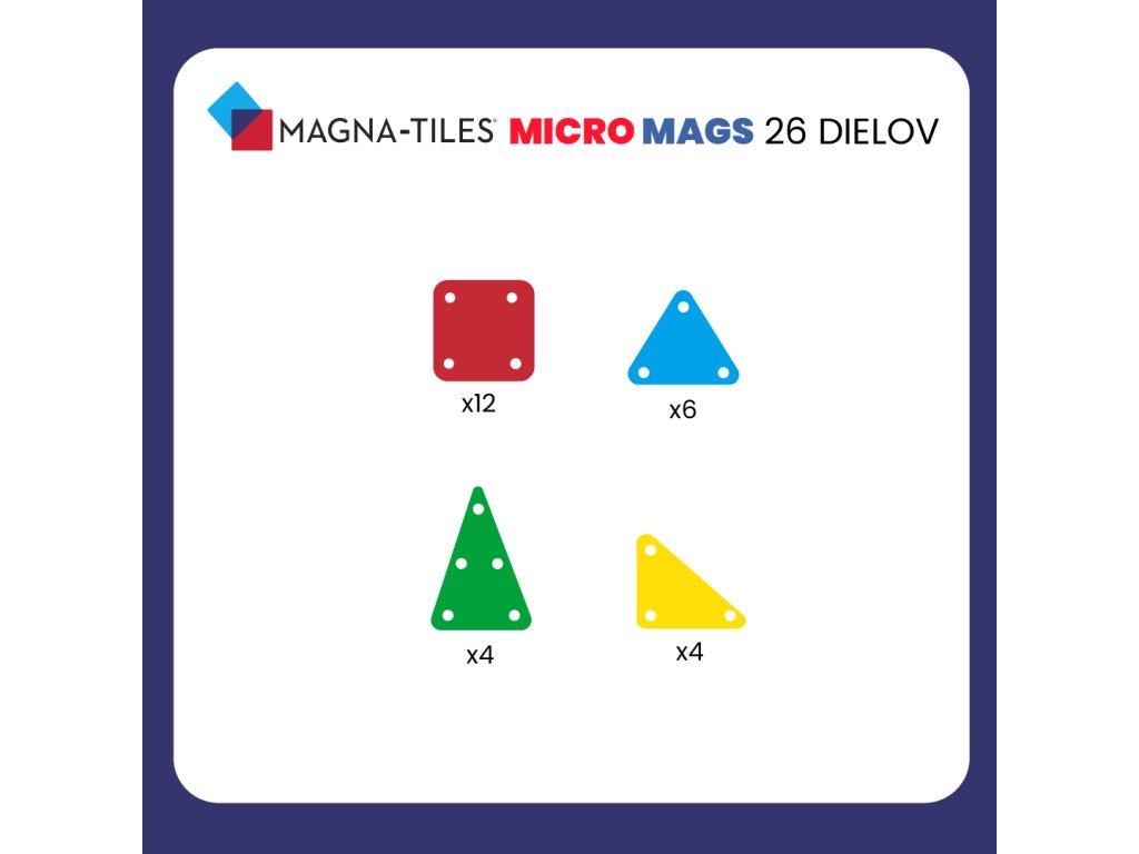 Magnetická stavebnica microMAGS Travel Set 26 dielov Cestovná sada MAGNA-TILES na každý výlet Magnetická stavebnica microMAGS Travel Set je ideálny spoločník na cesty. Prináša praktickosť a zábavu v jednom kompaktnom balení.Tento set obsahuje 26 magnetických dielikov, kde všetky diely sú o 75 % menšie ako tradičné MAGNA-TILES, čo umožňuje ešte detailnejšie stavby malých staviteľov.Kovový plechový obal poskytuje pohodlné skladovanie, vďaka ktorému je tento set dokonalým spoločníkom na rodinné výlety - zmestí sa do batohu, kabelky alebo cestovnej tašky, takže deti môžu mať svoje obľúbené stavebné diely vždy so sebou.Magnety microMAGS sú plne kompatibilné so všetkými ostatnými stavebnicami MAGNA-TILES, čo z nich robí skvelý doplnok k existujúcim sadám.Zmysluplná stavebnica pre malých staviteľov Stavebnica je nielen praktická, ale aj vysoko kvalitná a bezpečná. Dieliky sú vyrobené z potravinárskeho, netoxického plastu, ktorý neobsahuje BPA, ftaláty ani latex. Silné magnety a pevná konštrukcia zabezpečujú dlhú životnosť a nekonečné hodiny tvorivej zábavy. Táto stavebnica podporuje rozvoj jemných motorických zručností, koordinácie ruka-oko a kreativity, čo z nej robí ideálny darček pre deti vo veku už od 3 rokov.Sada obsahuje 26 magnetických dielikov microMAGS:4x pravý trojuholník, 4x rovnoramenný trojuholník, 6x rovnostranný trojuholník,12x štvorec.Dodatočné parametre