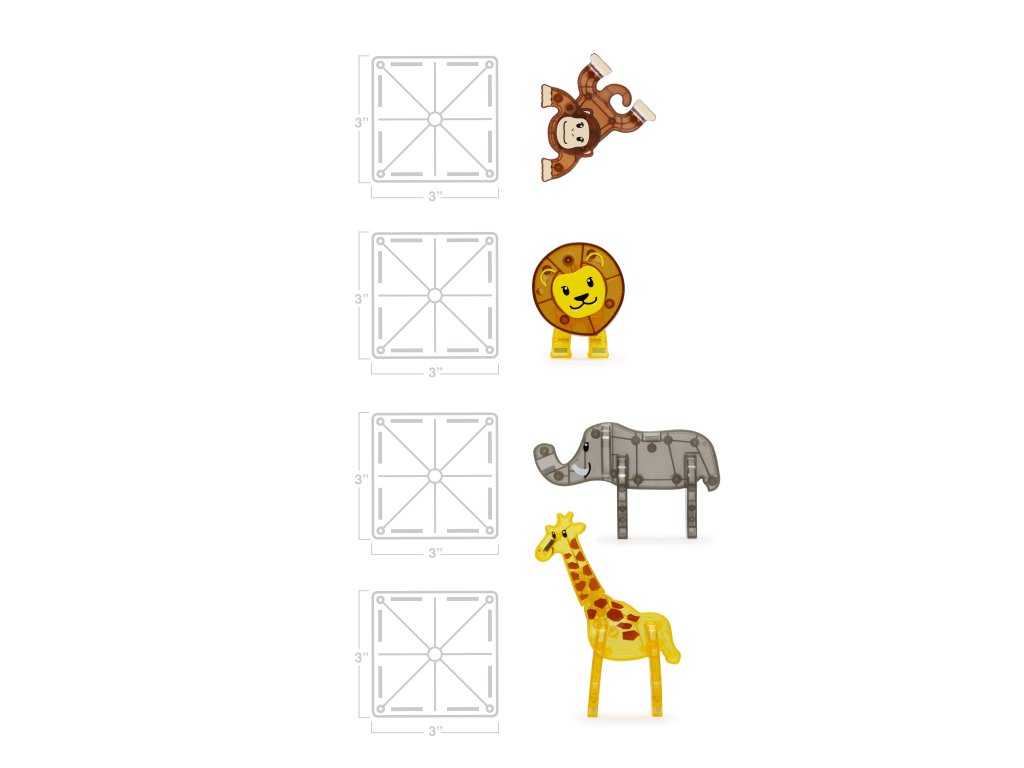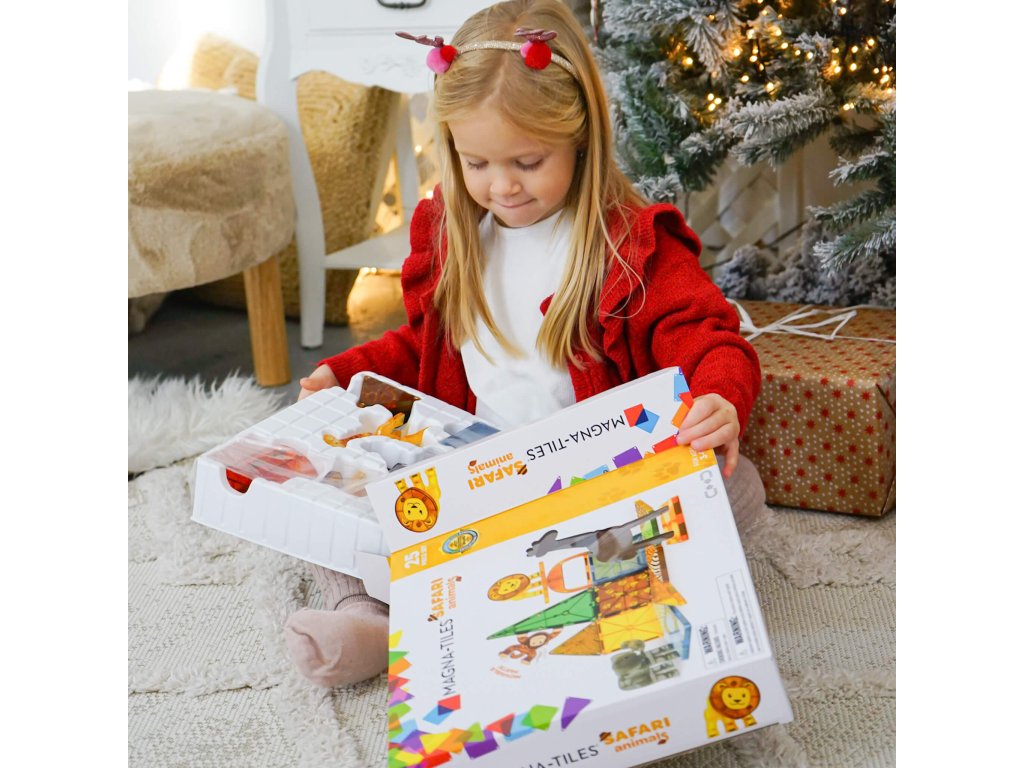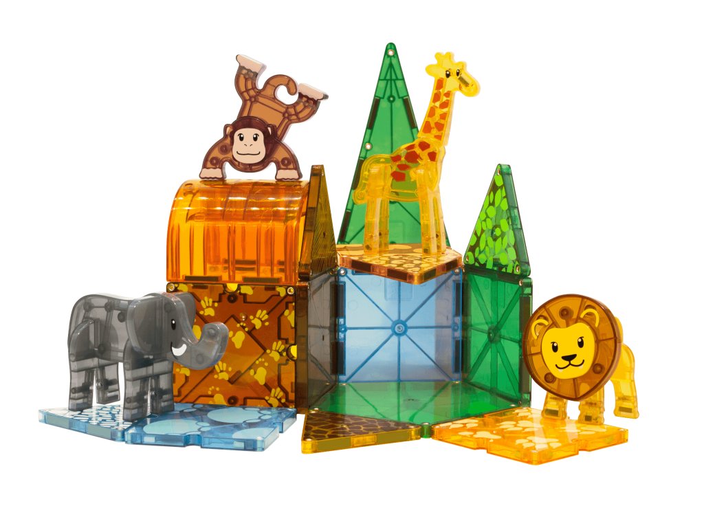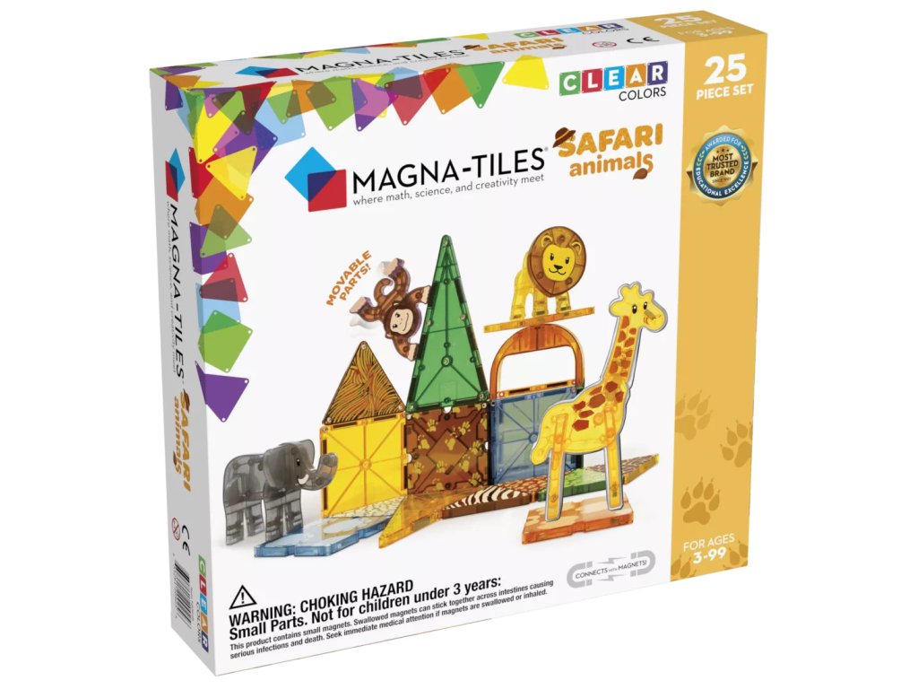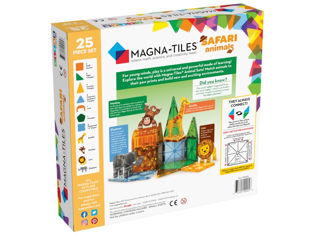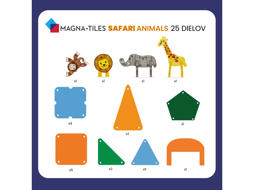 Magnetická stavebnica Safari 25 dielov Preskúmajte africkú divočinu a spoznajte safari zvieratká Úžasná magnetická stavebnica MAGNA-TILES® Safari Animals prináša deťom hodiny nápaditej a sústredenej zábavy. Súčasťou tejto sady sú safari zvieratká - slon, žirafa, opica a lev, s ktorými deti zažijú dobrodružstvo v divočine. S malými zvieracími pomocníkmi môžu preskúmať okolité prostredie alebo môžu každému zvieratku postavať útulné stanovište. Pre malých dobrodruhov s divokou fantáziou je africká savana ideálnym miestom na hranie. Deti sa navyše naučia fakty o divokých safari zvieratkách. Všetky diely sú plne kompatibilné a dopĺňajú sa so všetkými ostatnými súpravami MAGNA-TILES.Zmysluplná stavebnica pre malých staviteľov MAGNA-TILES je zástancom zmysluplnej hry, to znamená zábavnej a pútavej, no zároveň založenej na rozvíjaní detských zručností. Táto stavebnica podporuje rozvoj koordinácie ruka-oko, jemnej motoriky a logického myslenia prostredníctvom skúmania príčiny a následku. Bezpečnosť a špičková kvalita sú zaistené použitím potravinárskeho, netoxického plastu MABS bez BPA, ftalátov a latexu. Pevná konštrukcia dielikov zabraňuje praskaniu a udržiava magnety bezpečne na svojom mieste.Sada obsahuje 25 magnetických dielikov:9x malý štvorec,4x fugúrka (žirafa, opica, lev, slon),2x rovnoramenný trojuholník,2x, pravý trojuholník,6x rovnostranný trojuholník,1x oblúk,1x päťuholník.Dodatočné parametre