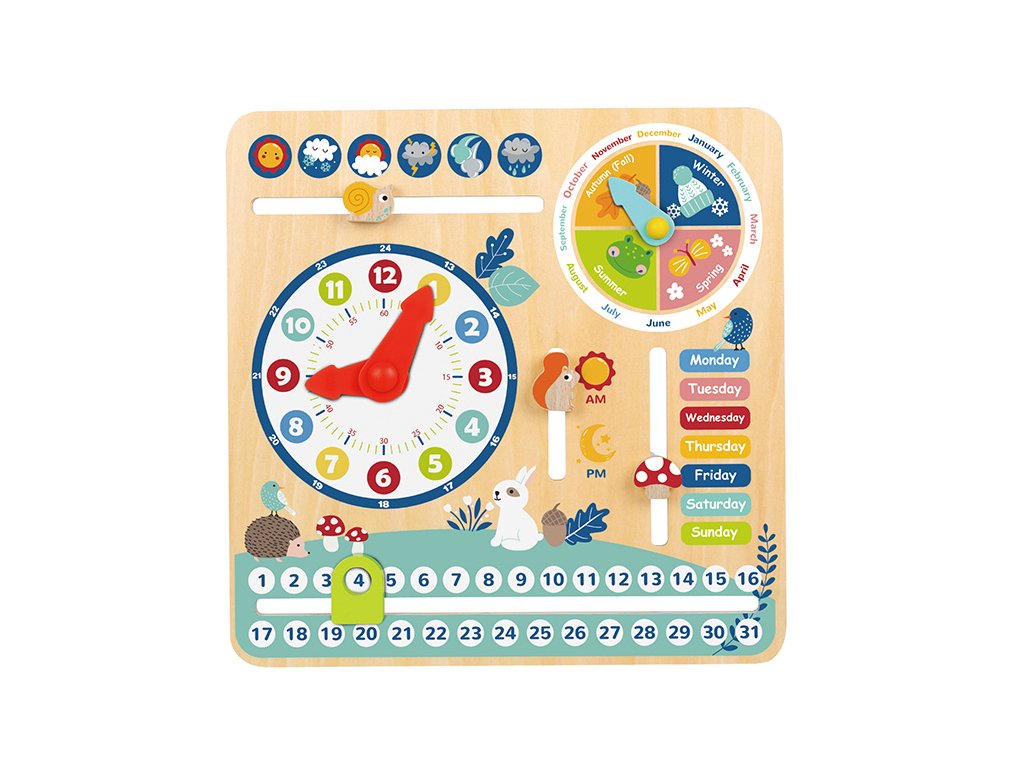 Môj kalendár Koľko je hodín? Nádherný drevený kalendár je úžasnou edukačnou pomôckou pre deti a taktiež aj skvelým dizajnovým doplnkom do detskej izbičky. Deti sa učia čas prostredníctvom ručičkových hodín, môžu si tiež v kalendári poznačiť, aký je mesiac, dátum, aké je počasie alebo či je doobedie či poobedie.Deti získavajú pojem o čase. Učia sa orientovať v rôznych častiach dňa, mesiaca a roku. Vďaka tomu si zlepšujú aj matematické schopnosti a logické myslenie. Vzdelávacia hračka je vysoko kvalitná, vyrobená s ohľadom na životné prostredie a bezpečnosť dieťaťa.Dodatočné parametre