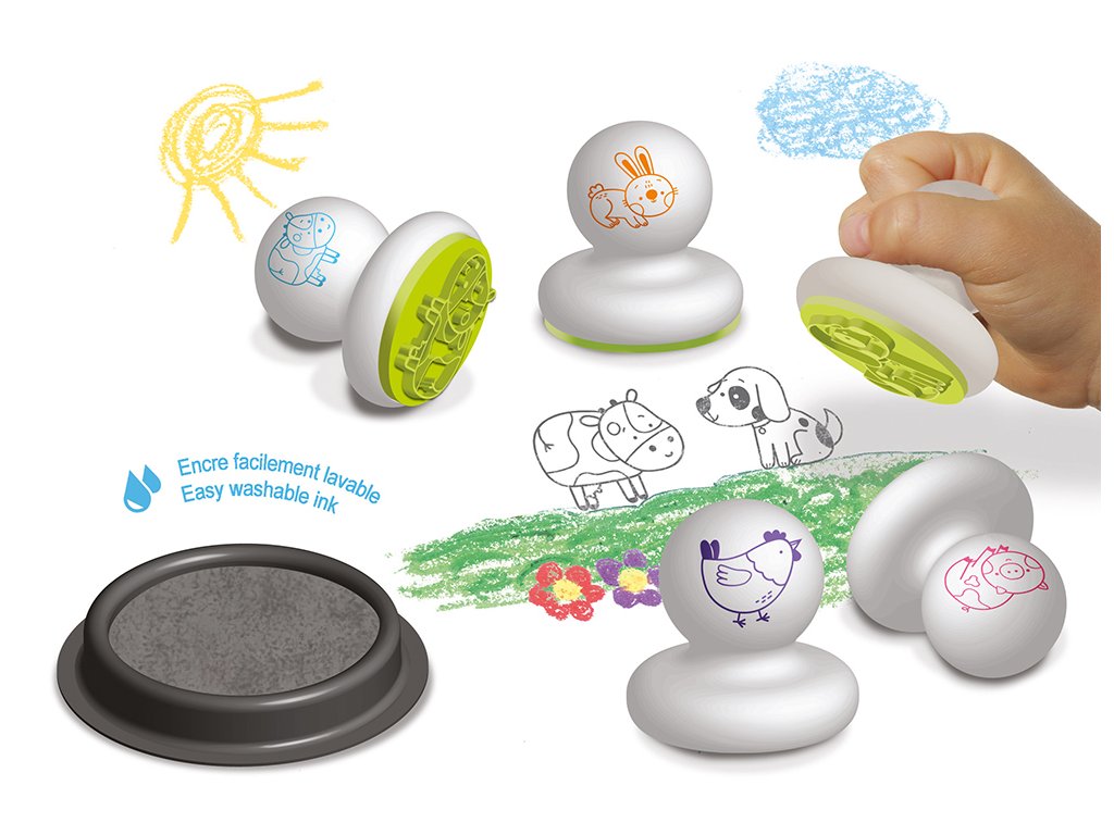 Moje prvé pečiatky Domáce zvieratká 6 ks Ergonomicky tvarované pečiatky pre najmenších Veľké okrúhle pečiatky pre deti s domácimi zvieratkami od francúzskej značky Crea Lign sú ergonomicky tvarované. Dobre sa držia malým ručičkám, a preto sú vhodné už pre deti od 12 mesiacov. V balení nájdete 5 veľkých pečiatok so zvieratkami a jeden veľký pečiatkovací vankúšik s čiernou farbou. Nemusíte sa báť ani špiny. Pečiatkovacia farba sa dá jednoducho umyť z ručičiek, vyprať z oblečenia a je úplne bezpečná.Skvelé na rozvoj úchopu a jemnej motoriky Okrúhle pečiatky pre najmenšie deti podporujú rozvoj rôznych zručností a kreativity. Produkt je vysoko kvalitný a bezpečný, rovnako ako všetky ostatné výrobky francúzskej značky Crea Lign. Jej cieľom je vyvíjať kreatívne potreby a hry, ktoré podporujú rozvoj deti a umožňujú každému nájsť to, čo ho baví.Dodatočné parametre