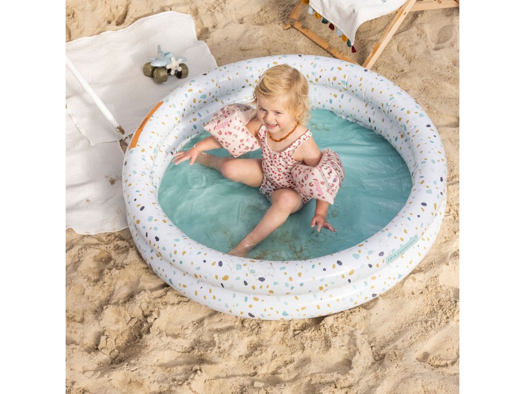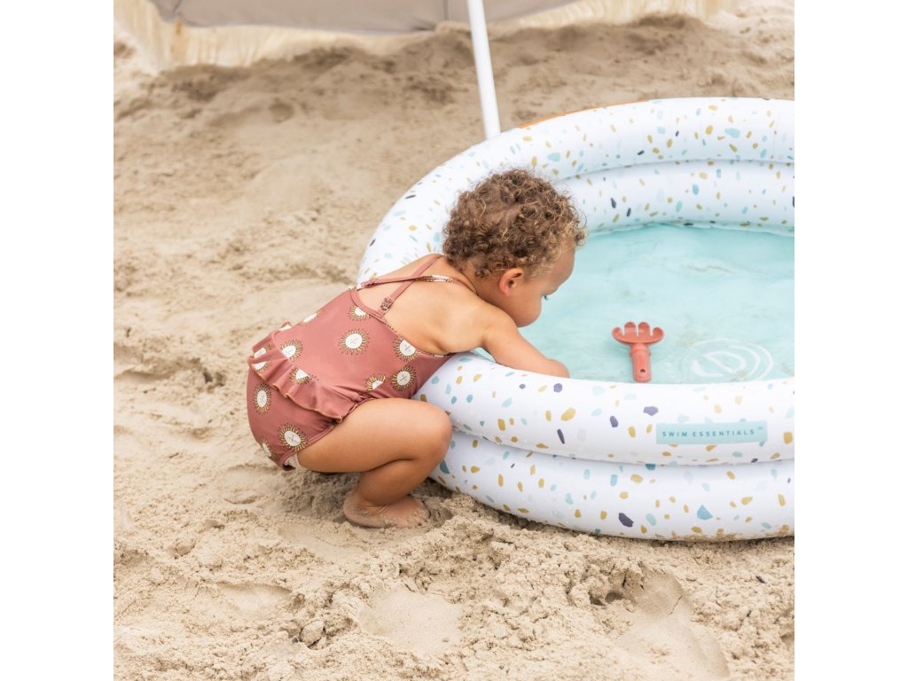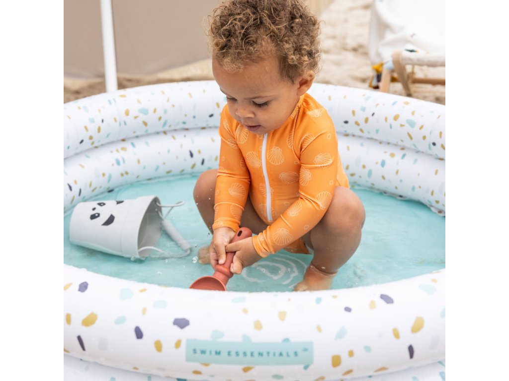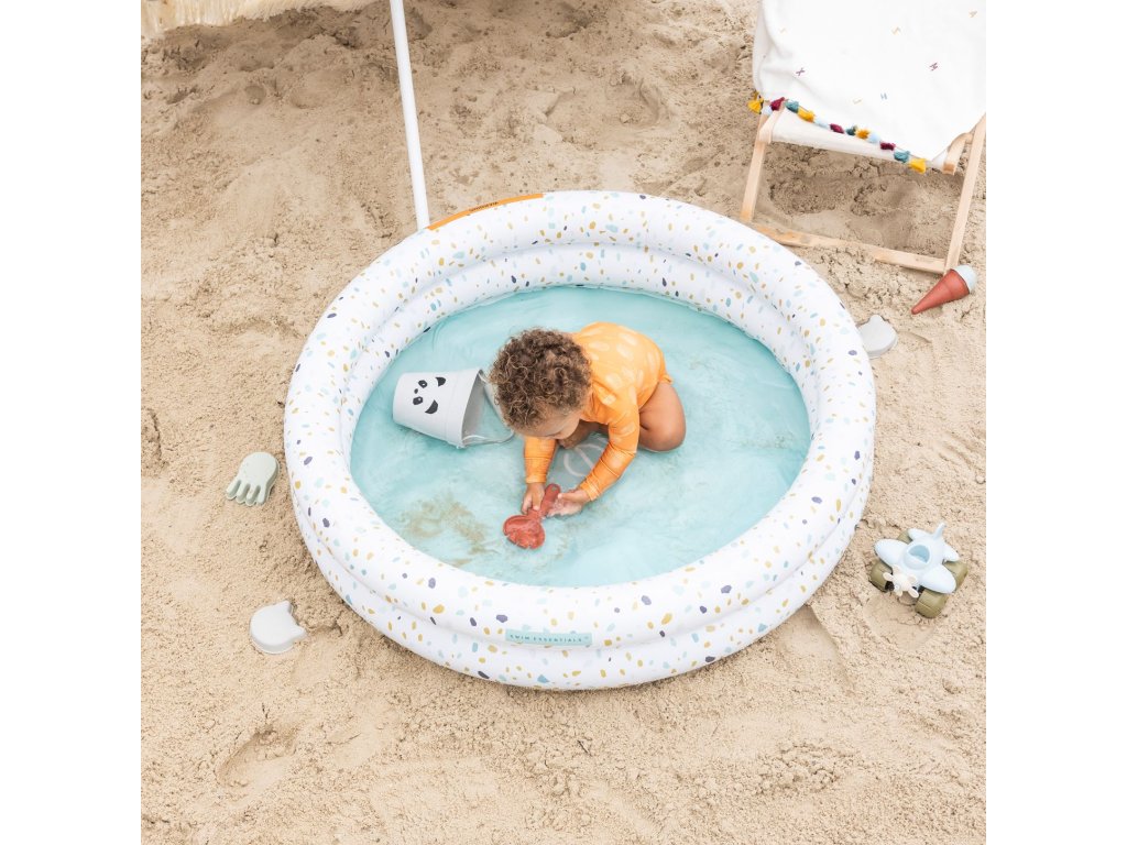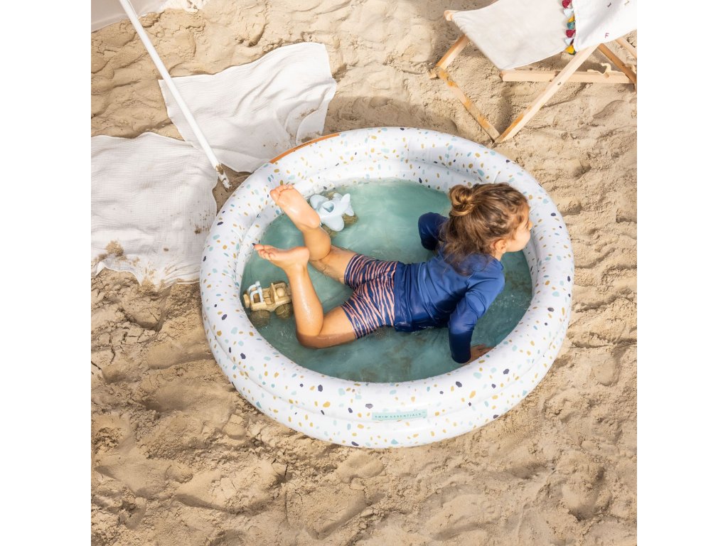 Nafukovací bazén pre deti Terrazzo 100 cm Vaše deti zažijú tie pravé vodné radovánky! Detský nafukovací bazén Terrazzo od Swim Essentials sa podobá na príjemný kamenný materiál s farebnými detailmi. Svojou veľkosťou je určený pre deti od 1 roku. Priemer kruhového bazéna je 100 cm, má 2 nafukovacie komory a zmestí sa do neho až 60 litrov vody. Detičkám tak poskytuje dostatočný priestor na vodné radovánky a letné osvieženie. Krásny nafukovací bazén na záhradu Skvele zapadne do vašej záhrady alebo na terasu. Môže byť aj vhodným bazénom na priestrannejší balkón. Veľkosť bazéna je 100 x 100 x 15 cm. Kvalitný detský nafukovací bazén Terrazzo zaistí nekonečnú zábavu Prémiová holandská značka Swim Essentials sa pri všetkých svojich výrobkoch zameriava na vysokú kvalitu, funkčnosť a neopozeraný štýl. Detské nafukovacie bazény sú preto vyrobené z odolného PVC. Vďaka tomu sú veľmi pevné a veľa vydržia. Značka tiež každý rok prináša nové neopozerané potlače, na ktorých si dáva veľmi záležať. Balenie bazéna je vyrobené z recyklovaného kartónu a nájdete v ňom aj jeden set na opravu prípadných dier. Nechýba ani bezpečnostné testovanie hračiek EN-71.Dodatočné parametre