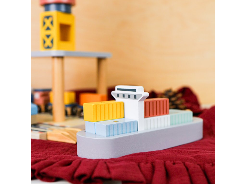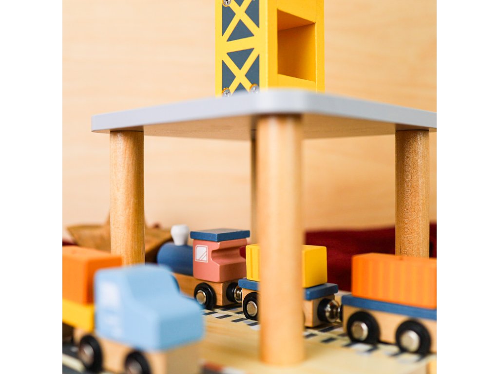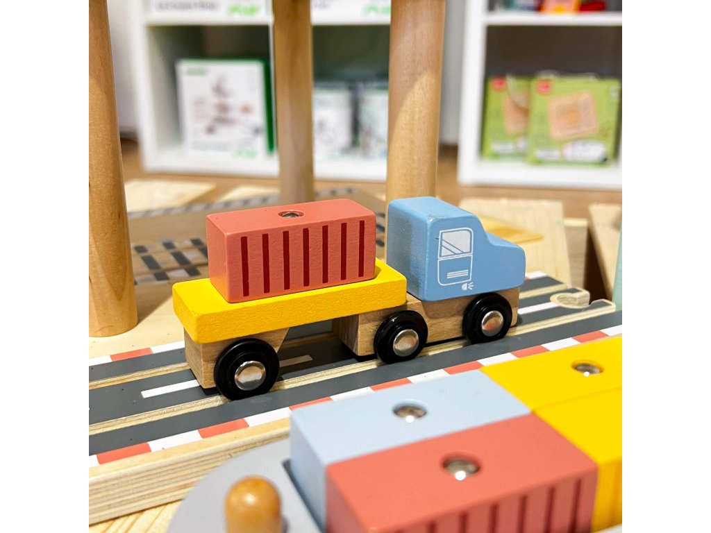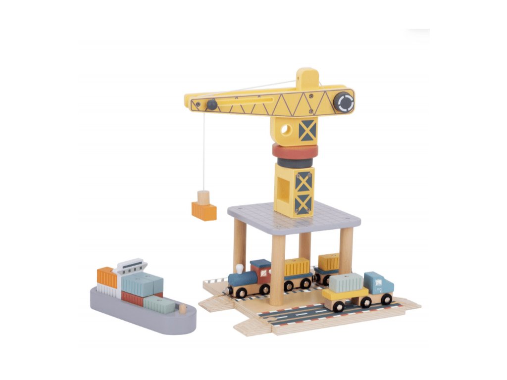 Nákladný prístav so žeriavom 24 ks Žeriav sa otáča a zdvíha náklad Bohatá drevená sada hračiek Nákladný prístav so žeriavom od Tooky Toy umožní vašim deťom stavať, voľne sa hrať a vymýšľať najrôznejšie scenáre. Dominantou sady je mechanický drevený žeriav, ktorý sa naozaj otáča a dokonca dvíha náklad vďaka otočnému koliesku a šnúrke s magnetom. Nechýba ani vlak, nákladné auto, loď a koľajnice. Deti tak premiestňujú kontajnery z vlaku či auta na nákladnú loď a späť. Kontajnerov s magnetkami je v sade 12 a deti tak skladanie nákladu hneď tak neomrzí. Sadu je možné kombinovať s drevenou vláčikovou dráhou.Drevená sada rozvíja fantáziu Deti si pri hre s dreveným nákladným prístavom a žeriavom vymýšľajú vlastné príbehy, rozvíjajú si samostatnosť aj predstavivosť. Trénujú si aj jemnú motoriku aj koordináciou ruka-oko pri nakladaní kontajnerov. Pri hre vo dvojici si cvičia svoje sociálne zručnosti. Drevené hračky pre deti Tooky Toy sú kvalitné, bezpečné, farby a lepidlá sú netoxické. Súprava je vhodná ako originálny darček pre deti od 3 rokov.Dodatočné parametre