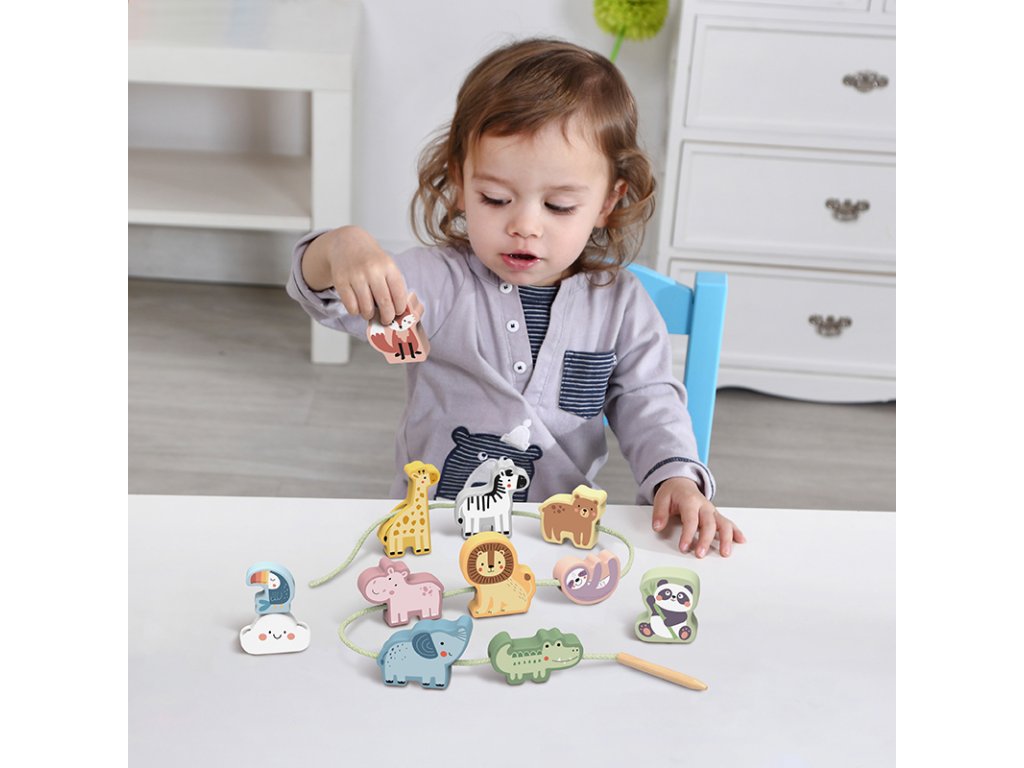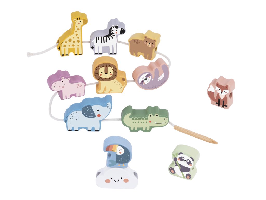 Navliekanie Zvieratká Pastel 13 ks Veľké korálky pre najmenších v podobe zvieratiek Sada korálikov pre deti Zvieratká v pastelových farbách od Tooky Toy je jedinečnou zábavnou aj vzdelávacou hračkou. Sada drevených korálikov obsahuje 12 drevených zvieratiek a 1 bezpečnú drevenú ihlu so špagátom v priehľadnej prenosnej tube. Sada je skladná, takže ju pokojne môžete deťom zbaliť aj na cesty a je skvelá ako malý darček pre deti.Navliekanie korálikov podporuje rozvoj detí Vďaka sade drevených korálikov Zvieratká si deti pri navliekaní cvičia jemnú motoriku, trpezlivosť a koncentráciu. Veľké Drevené korálky dobre padnú do detskej ručičky. Deti sa ale tiež učia pomenovávať zvieratká, hrajú sa s nimi, alebo ich dokonca stavajú na seba ako balančnú hru. Drevené hračky Tooky Toy sú vyrobené s ohľadom na bezpečnosť detí a životné prostredie. Farby sú netoxické a zdravotne nezávadné. Hračka je vhodná pre deti od 2 rokov.Dodatočné parametre