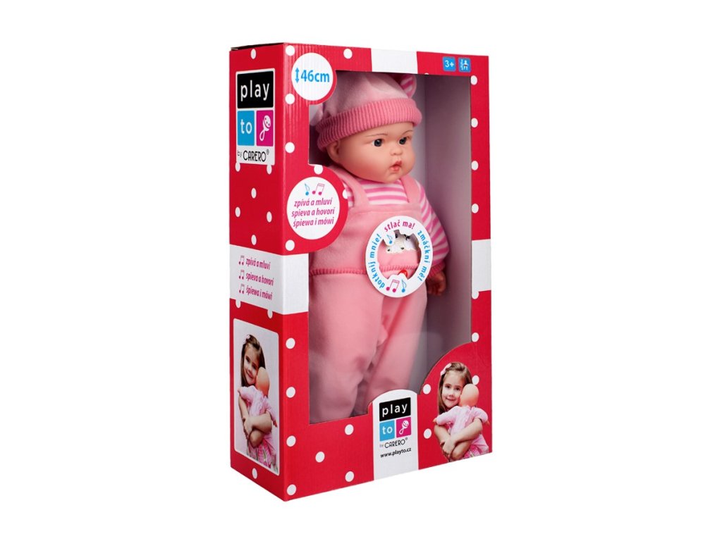 Detská bábika PlayTo. Skvelá hračka pre každé dievčatko. Hlava, ruky a nohy sú vyrobené z gumy, telíčko potom z mäkkého materiálu. Bábika má celu sadu oblečenia, vrátane topánok a čiapočky. Celé oblečenie možno sňať a vyprať. Dĺžka bábiky 46 cm. Bábika má poľský modul a hovorí tieto poľské vety: mamusiu, tatusiu, tatusiu weź mnie na rączki, mamusiu kocham cię a iné. Bábika spieva tieto poľské pesničky: Jadą jadą misie, Kosi kosi łapci, Miała baba koguta, Ta Dorotka, My jesteśmy krasnoludki.Dodatočné parametre