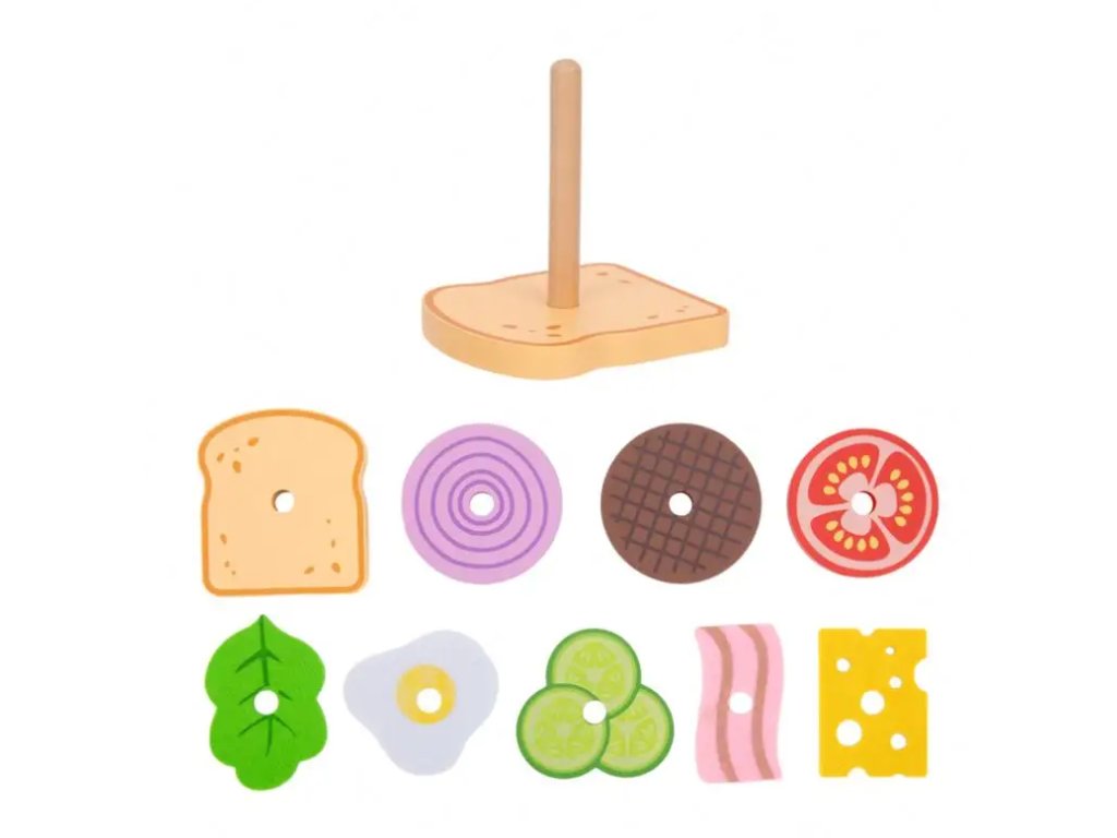 Poskladaj si sendvič Pre rozvoj motoriky S nasadzovacou vežou Poskladaj si Sendvič deti objavujú svet tvarov a farieb. Učia sa pomenovať potraviny, zlepšujú si motoriku a myslenie. Sada obsahuje 10 kúskov potravín vrátane sendvičového chlebu, slaniny, volského oka, uhorky, paradajky, syru a cibule.Rôzne kombinácie skladania sendviča Obsah sendviča môžu vyskladať v rôznych kombináciách, buď podľa predlohy, alebo podľa vlastnej fantázie, čím rozvíjajú svoju kreativitu. Nasadzovacia veža je vyrobená z kvalitného dreva a netoxických farieb.Dodatočné parametre