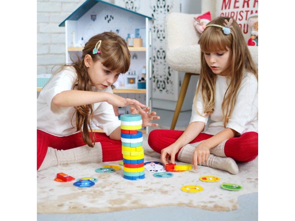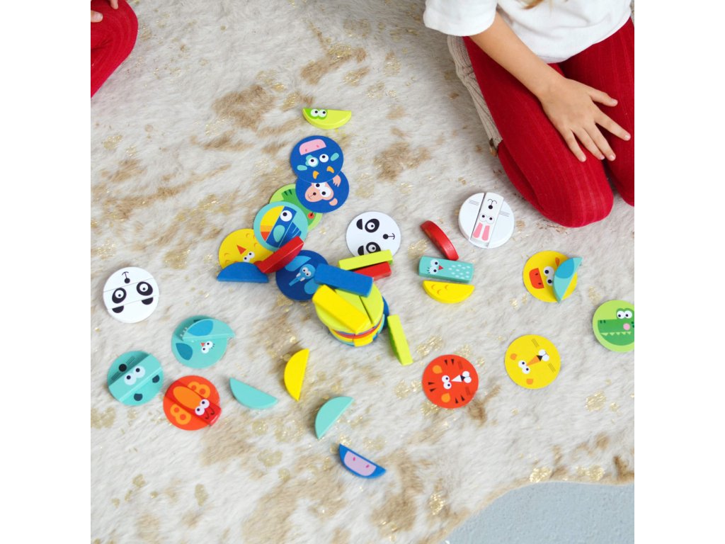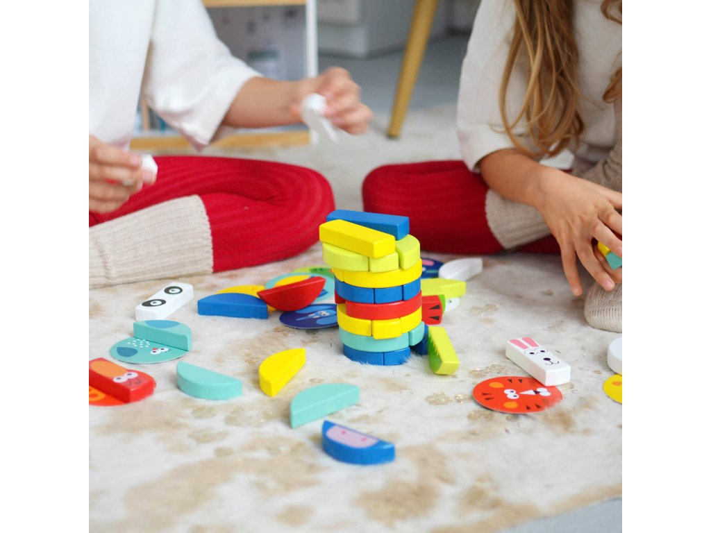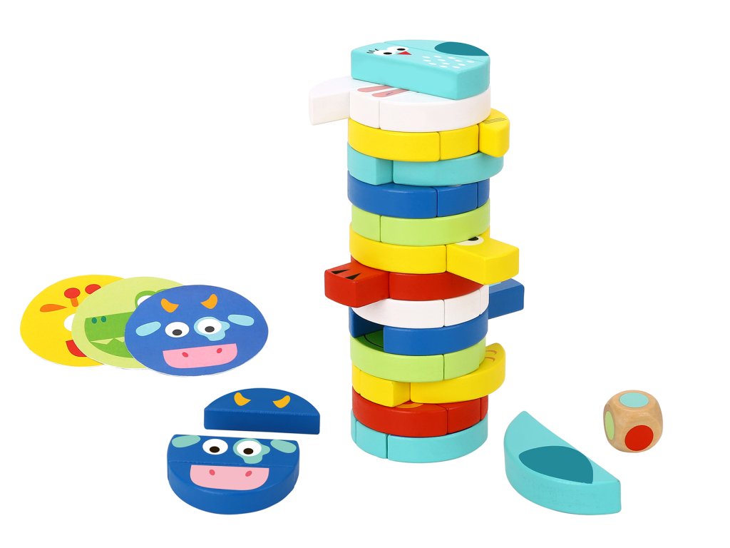 Prvá jenga Zvieratká Jenga môže hrať celá rodina! Zjednodušená verzia klasickej hry Jenga od Tooky Toy so zvieratkami zaujme deti aj dospelých. Deti v tejto balančnej hre nájdu namiesto klasických kvádrov hlavičky zvieratiek, vždy rozdelené na tri časti. Postavíte z nich vežu, hodíte kockou a môžete začať s vyťahovaním správnych farebných dielikov tak, aby veža nespadla. K hre sú aj predlohy všetkých zvieratiek, detičky si tak podľa nich môžu skladať aj samé.Jenga trénuje pozornosť, opatrnosť a trpezlivosť. Deti sa počas hrania zoznámia s jednotlivými zvieratkami alebo si zopakujú farby. Cvičí si jemnú motoriku a koordináciu oko-ruka. Skvelé ako hra pre celú rodinu, ale aj na samostatné hranie.Dodatočné parametre