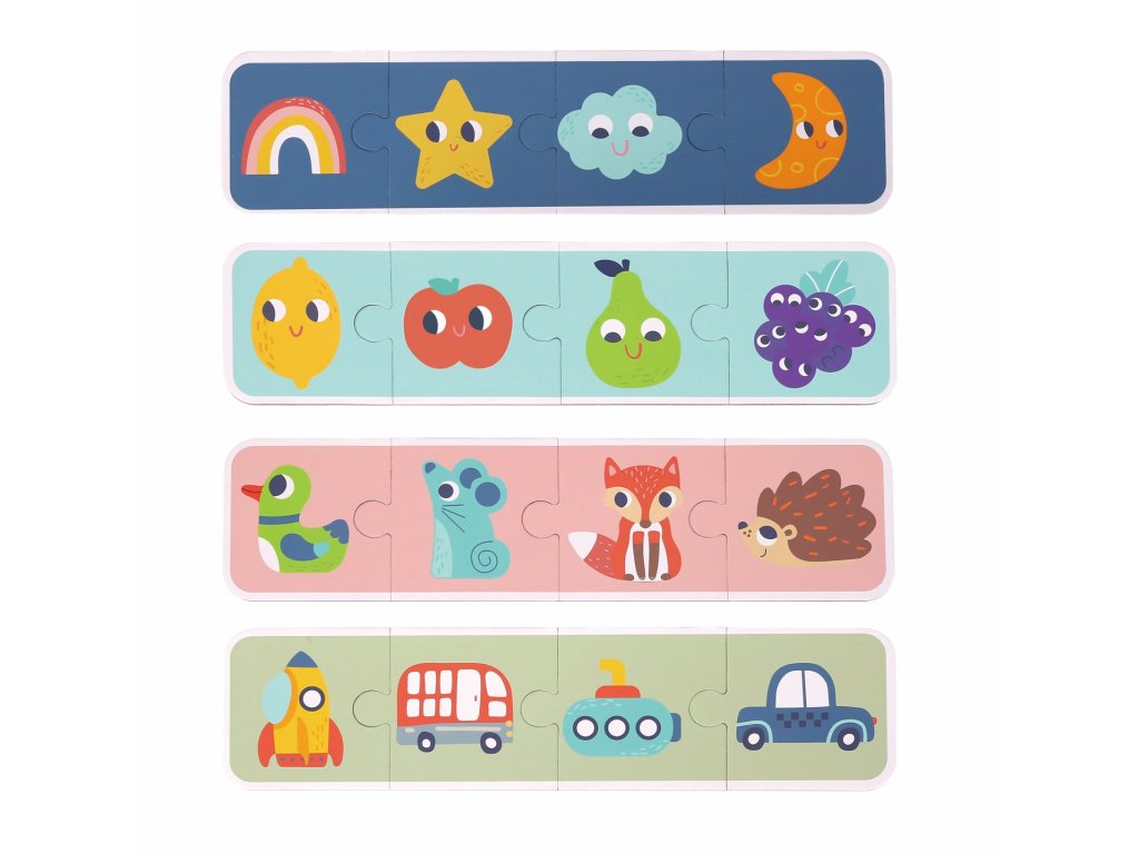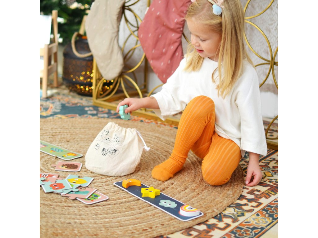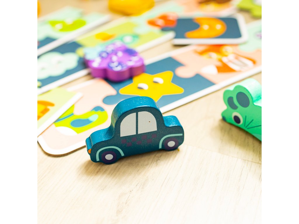 Senzorické pexeso a puzzle S týmto dreveným pexesom sa zabavia všetky deti, samé, ale aj spoločne. Malé detičky si môžu karty s obrázkami položiť pred seba a spomedzi tvarov vybrať a správne priradiť - tvar položiť na správne miesto na kartičke. Ale inak je drevené pexeso určené pre dvoch až piatich hráčov. Hráči si rozdajú náhodne kartičky, ktoré si položí každý pred seba. V taške sú uložené drevené tvary. Spolu ich je 16.Skvelá hra rozvíja jemnú motoriku, logiku a pamäť. Hráči si po jednom náhodne vyberajú z tašky predmety a ak ho majú na kartičke, priložia ho na správne miesto na nej. Vyhráva hráč, ktorý zaplní svoju kartičku najrýchlejšie.Dodatočné parametre