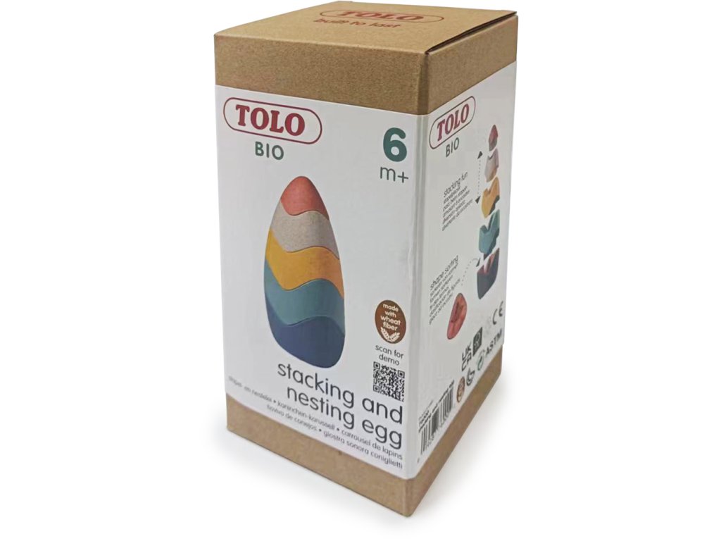 Stohovacia veža Vajíčko (BIO) Edukatívna hračka pre rozvoj bábätka Stohovacia veža Vajíčko je ideálna hračka pre deti od 6 mesiacov, ktoré sa učia manipulovať s predmetmi a skúmajú svet okolo seba. Je to zábavná a zároveň edukatívna hračka, ktorá podporuje vývoj bábätka. Rozvíja jemnú motoriku a koordináciu oko-ruka, podporuje logické myslenie a riešenie problémov, učí dieťa rozoznávať farby a veľkosti, rozvíja predstavivosť a kreativitu, poskytuje zábavu na dlhé hodiny.BIO hračky bezpečné pre najmenších Všetky produkty značky Tolo sú navrhnuté s ohľadom na odolnosť a bezpečnosť pre najmenších. Pri produkcii sú ohľaduplní k planéte. Aby znížili uhlíkovú stopu, používajú nové bio plasty z pšenice. Ich recyklovateľné obaly majú potlač zo sójového atramentu.Dodatočné parametre