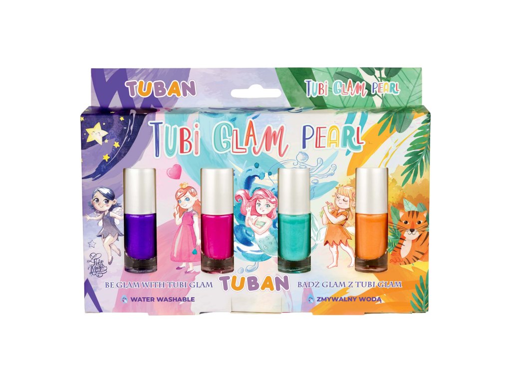 Tubi Glam lak na nechty Set 4 ks Laky v darčekovom balení Tubi Glam lak na nechty poteší nejednu malú slečnu. Táto sada obsahuje hneď 4 najobľúbenejšie. Lak je vytvorený na vodnej báze. Dôkladne prekryje celý necht a jednoducho sa zmýva teplou vodou. Navyše, má horkastú chuť, vďaka čomu pomáha odbúrať zvyk obhrýzať si nechty. Vďaka svojmu baleniu je tento set skvelým typom na narodeninový darček.Kvalitná detská kozmetika Tuban kozmetika je navrhnutá s ohľadom na citlivú detskú pokožku. Je vyrobená z bezpečných ingrediencií, čo znamená, že sa nemusíte obávať o zdravie svojich detí. Okrem toho podporuje ochranu ich pokožky, čím zabezpečuje celkovú starostlivosť a bezpečnosť.Dodatočné parametre
