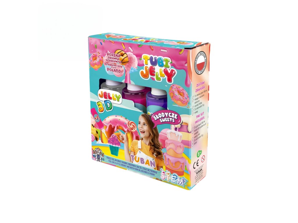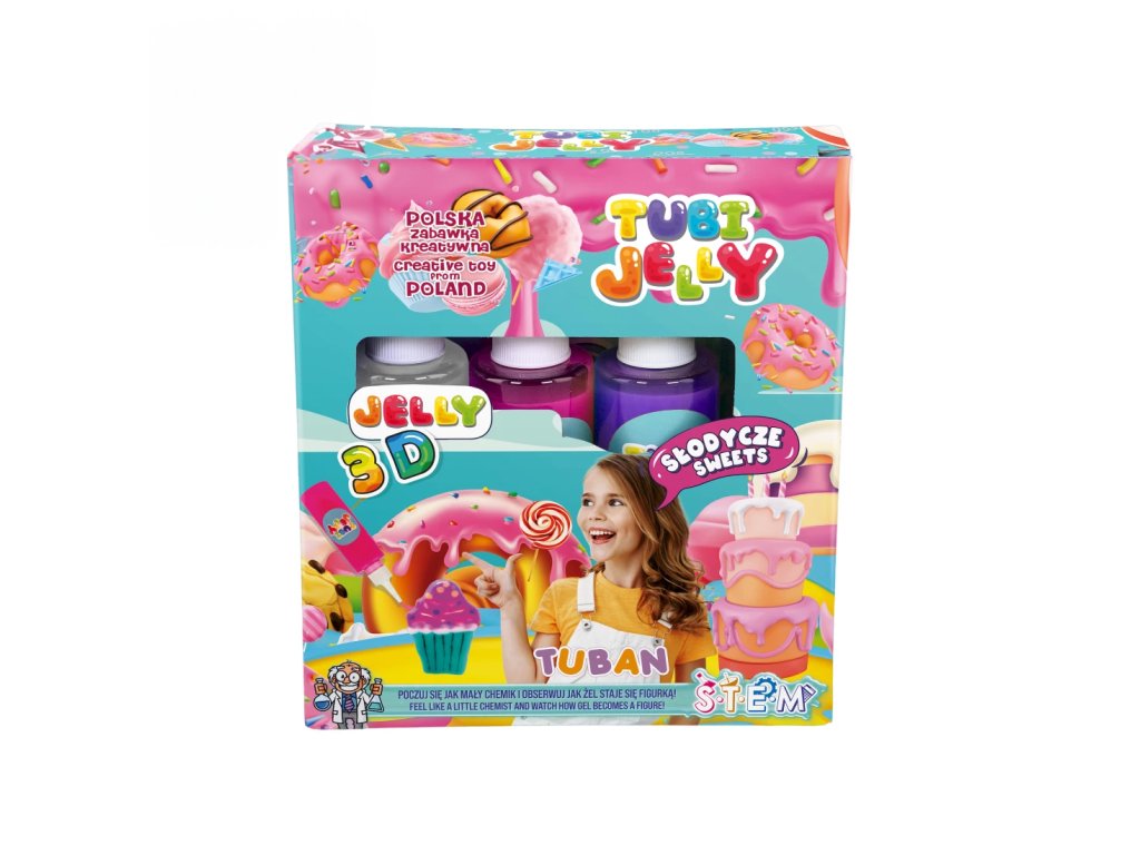 Tubi Jelly Kreatívny set Sladkosti Vytvorte si 3D gélové figúrky Tubi Jelly set je jedinečná tvorivá sada na tvorbu trojrozmerných figúrok. Sada obsahuje 3 farebné gély a šablóny na kreslenie s motívmi sladkostí. Po vyplnení šablóny gélmi ju ponoríte do rozpusteného aktivátora a vaša postavička sa premení na svoju trojrozmernú verziu. Vďaka priloženej prázdnej fólii si deti môžu nakresliť a vytvoriť čokoľvek im napadne.Sada obsahuje:tekutý gél 150 ml v 3 farbách (biela, ružová, fialová),tematické šablóny,3 x 5 g aktivátora,nádobu na prípravu figúrok.Ocenená hračka roka 2021 V roku 2021 bol produkt Tubi Jelly ocenený titulom Hračka roka v kategórii kreatívne hračky. Vyskúšajte ho aj vy.Všetky produkty značky Tuban sú vyrobené z kvalitných materiálov, sú bezpečné a netoxické, čo znamená, že sa nemusíte obávať o zdravie svojich detí a môžete mať istotu, že ich čakajú len tie najlepšie zážitky.Dodatočné parametre