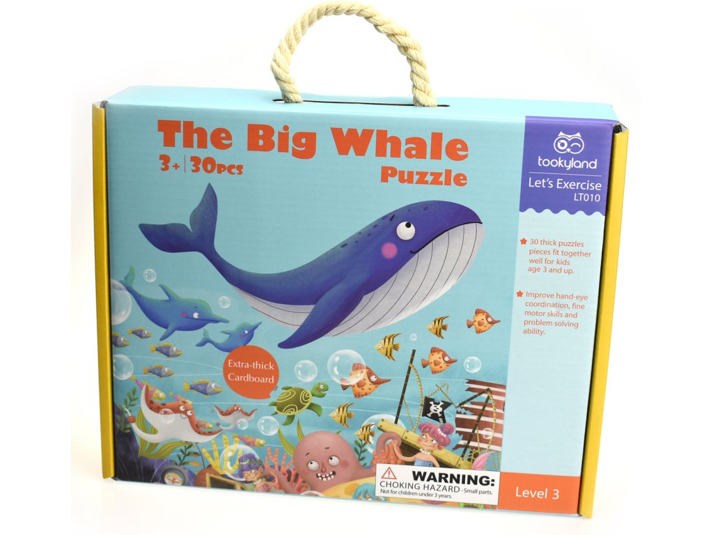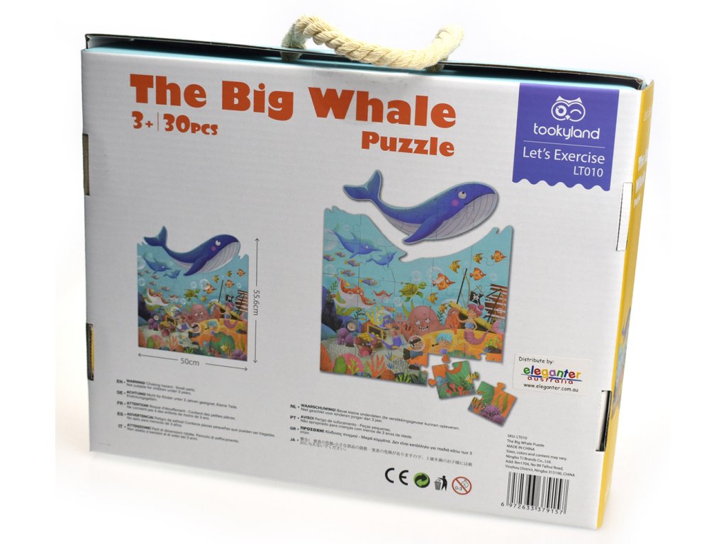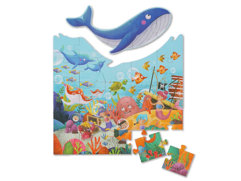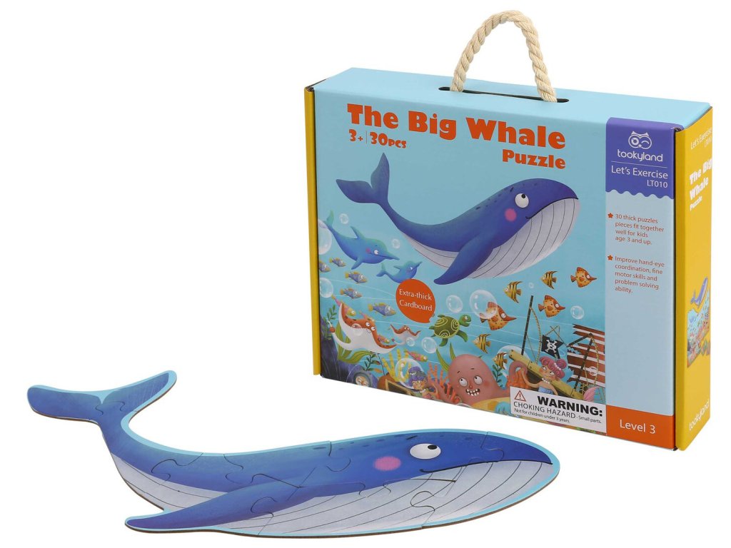 Tvarované puzzle Veľryba 30 ks Poskladajte si magický svet pod morom s tvarovanými puzzle. Puzzle obsahuje 30 tvarovaných kúskov. Veľryba v tejto skladačke bola špeciálne vyrezaná a možno ju postaviť ako súčasť skladačky alebo ako vlastnú mini 6 dielnu skladačku.Tieto puzzle sú vyrobené z vysokokvalitného papiera a dobre do seba zapadajú. Puzzle k vám prídu v krásnom kartónovom kufríku s rukoväťou a každý kúsok skladačky má približne 9,5 cm.Dodatočné parametre