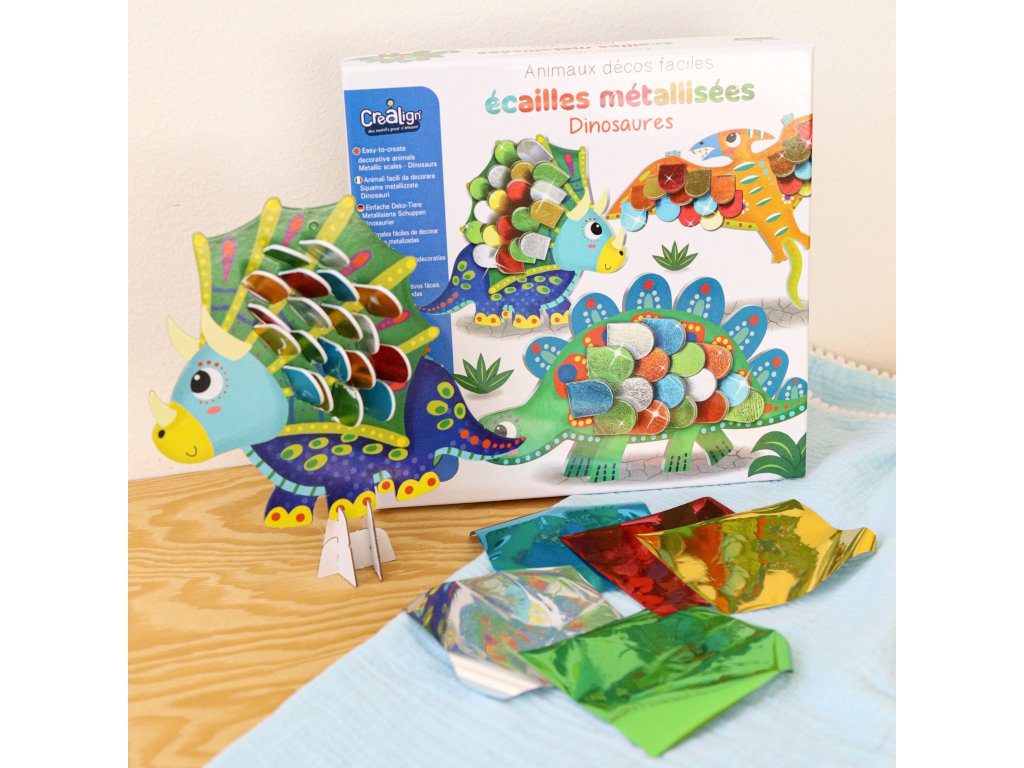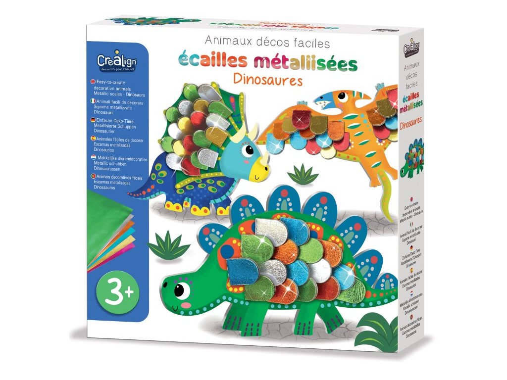 Tvorenie so šupinami Dinosaury 3+ Vytvor si lesklé dinosaurami! Kreatívna súprava pre deti Tvorenie so šupinami Dinosaury od francúzskej značky Crea Lign z radu Jednoduché obrázky je vhodná už pre deti od 3 rokov. Obsahuje 3 dinosaurami z tvrdého kartónu, 64 šupín na nalepenie a 6 hárkov s metalickými farbami. Vďaka nim si deti dinosaurami jednoducho dotvoria a vzniknú im originálne 3D obrázky, ktoré si zavesia na stenu.S Crea Lign sa deti učia nové umelecké techniky Deti najskôr odlepia šupinu, položia ju na papier s metalickou farbou, kde získa svoj jedinečný lesk, následne ju nalepia na obrázok. Súprava podporuje rozvoj jemnej motoriky, predstavivosti i kreativity. Produkt je vysoko kvalitný a bezpečný, rovnako ako všetky ostatné výrobky francúzskej značky Crea Lign.Dodatočné parametre