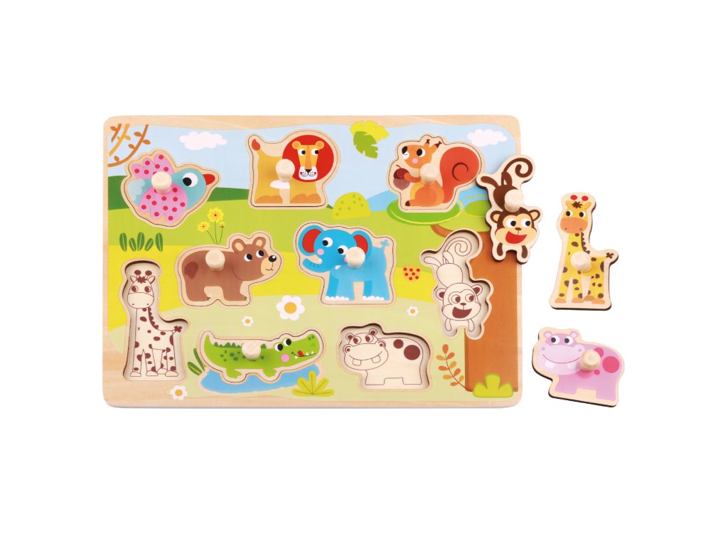 Vkladacie puzzle Zvieratá Deti si naučia pomenovať rôzne zvieratká. Tematické puzzle obsahuje podkladovú dosku a 9 drevených zvieratok. Je odolné, vyrobené z udržateľného dreva, ručne natreté farbami na vodnej báze a fixované lepidlom bez formaldehydu.Vkladacie puzzle rozvíja jemnú motoriku Zlepšuje tiež koordináciu oko-ruka, trpezlivosť a schopnosť samostatne sa hrať. Vďaka veľkým dielikom s úchytkami je vhodné už pre deti od 18 mesiacov.Dodatočné parametre
