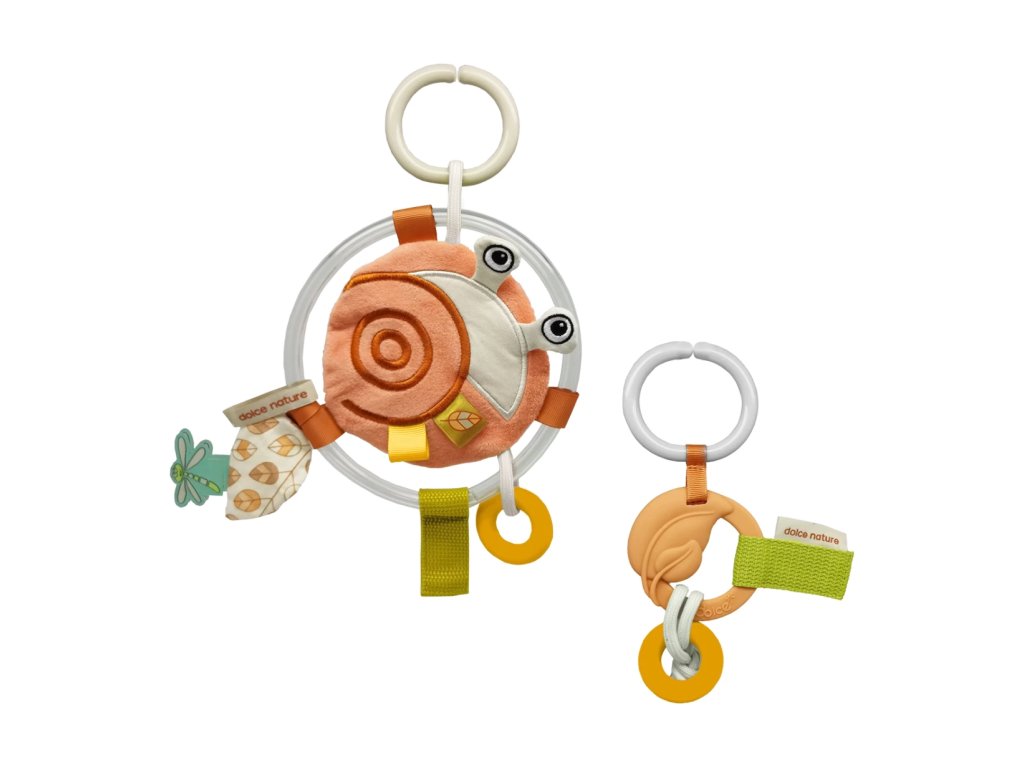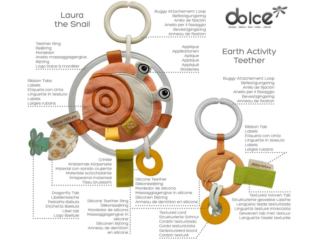Závesná senzorická hračka Slimák a silikónové hryzátko Bábätko môže posilňovať ďasná Závesná senzorická hračka Slimák a silikónové hryzátko pomáhajú bábätkám posilňovať ďasná a pomôžu im s prerezávaním prvých zúbkov. Časť slimáka má šuchotavú výplň pre rozvoj sluchu, štítok v tvare vážky zase pomáha rozvíjať hmat. Vďaka závesným krúžkom sa dajú obe časti hračky zavesiť napríklad na postieľku alebo kočík. Podporuje rozvoj bábätiek a najmenších Produkty Earth od značky Dolce sú inšpirované svetom prírody a boli vyvinuté s ohľadom na odolnosť. Každý výrobok bol navrhnutý a vyvinutý podľa zásad STEM, a preto je plný vzdelávacích aktivít. Hračky majú minimalistický dizajn, sójovú potlač, látky a materiály najvyššej kvality a plne recyklovateľné obaly. Ako všetky hračky Dolce, aj tieto sa dajú prať v práčke.Dodatočné parametre