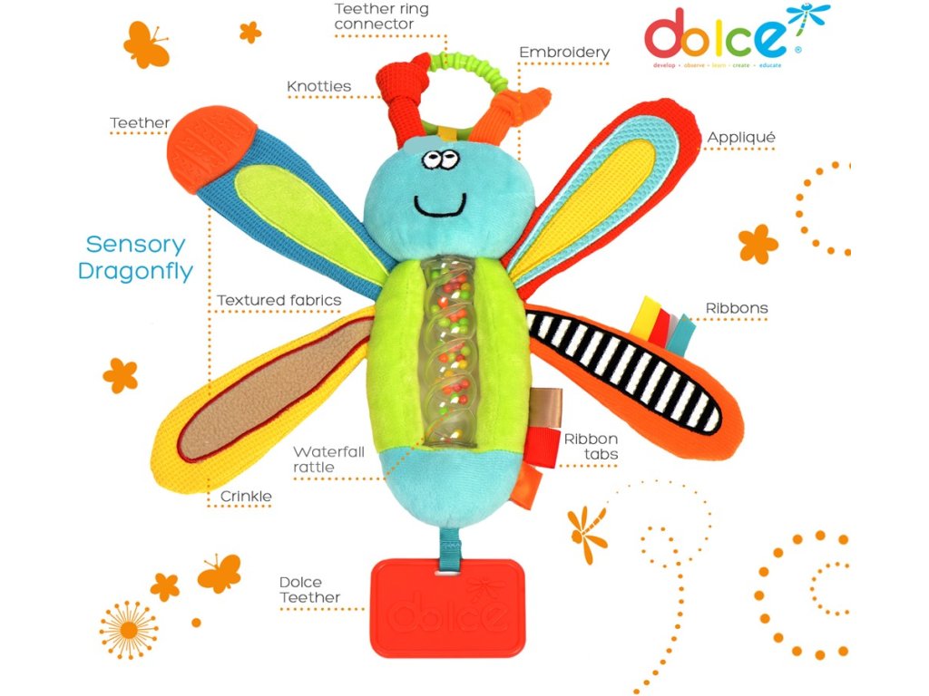 Závesná senzorická hračka Vážka Hračka s pestrými krídlami a hrkálkou Závesná senzorická hračka Vážka obsahuje rôzne prvky, ktoré podporujú rozvoj zraku, sluchu, hmatu, motoriky a predstavivosti dieťaťa. Jej krídla sú vyrobené z látok rôznych textúr, ktoré motivujú dieťa k dotyku, na brušku má špirálovitú hrkálku. Hračka má na sebe upevnené stužky, uzly, hryzátko, šuchotajúce prvky, ktoré budú rozvíjať zmysly a motoriku dieťatka. Dá sa zavesiť napríklad na postieľku alebo kočík.Overené STEM Produkty Dolce boli nezávisle posúdené a spĺňajú prísne kritériá pre podporu učenia sa v oblastiach STEM (Science, Technology, Engineering, Mathematics). To znamená, že hračky podporujú zvedavosť a kritické myslenie, umožňujú deťom experimentovať a riešiť problémy, rozvíjajú zručnosti v oblasti STEM a sú vhodné pre vek a úroveň rozvoja dieťaťa.Dodatočné parametre