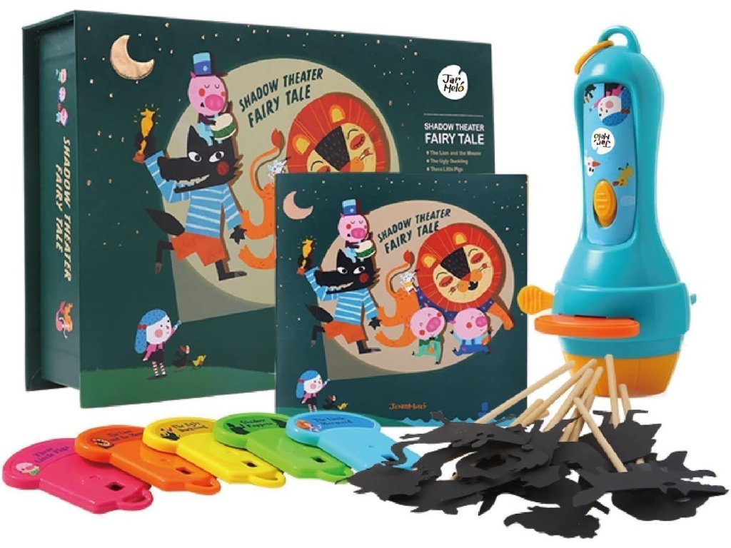 Rozprávková premietacia baterka Tieňové divadlo Premeňte stenu na rozprávkové plátno Táto čarovná baterka s premietacím mechanizmom premení každú stenu či strop na rozprávkové divadlo plné tieňových bábok. Stačí vložiť disk so štyrmi scénami a pridať figurky na tyčinke – potom len zapnúť svetlo a začať rozprávať vlastný príbeh.Čo na vás čaká v balení? 4 farebné disky s motívmi rozprávok (škaredé káčatko, 3 prasiatka, morská víla a lev)1 disk s tieňmi11 tieňových bábok na tyčinkách – zvieratká a postavičky z rozprávok Praktická baterka – projektor s posuvným mechanizmom a LED svetlom Knižka s príbehmi v anglickom jazyku – ideálne pred spaním, kde sa deti učia rozprávať, sústrediť a rozvíjať fantáziuJednoduché skladanie a pekné balenie Viac než len zábava – rôzne podnety k rozprávaniu, koncentrácii a rozvoju rečiDodatočné parametre